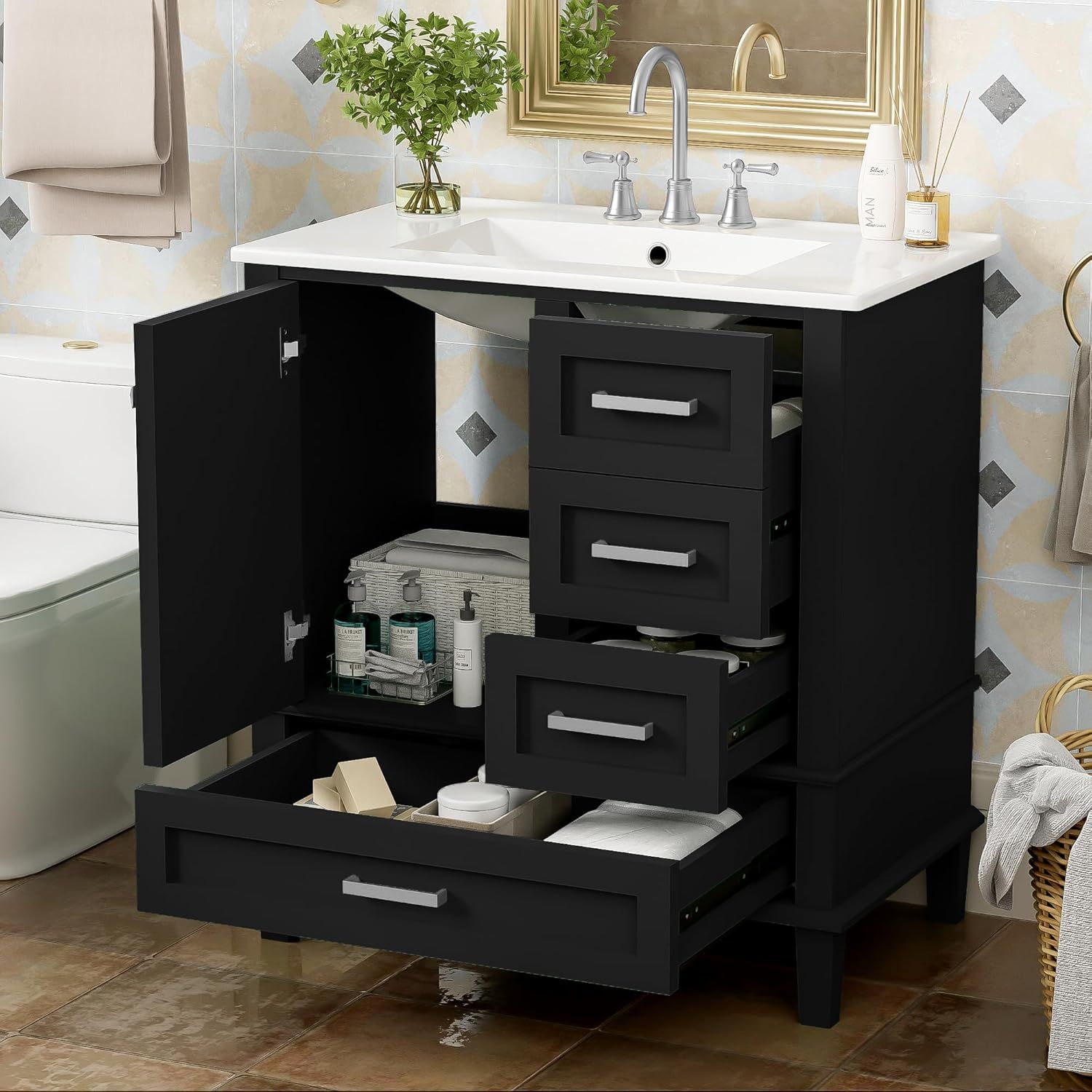 UCL - N729P170557B [30 Inch Bathroom Vanity with Ample Storage Space]: Equipped with a 30" sink, this bathroom vanity provides ample storage space, featuring 1 cabinet and 3 drawers of different depths and widths, perfect for neatly organizing various bathroom essentials, keeping your bathroom tidy and clutter-free. [Bathroom Vanity with Sink 30"]: Constructed with a solid wood frame and MDF panels, this bathroom cabinet ensures excellent stability and durability, resistant to cracking. The countertop is made of ceramic material, which is smooth and textured, with an ideal depth to prevent splashing water. The surface of the dresser is waterproof. [Sturdy Bathroom Vanity with Top]: In order to ensure the practicality and durability of bathroom vanity, we made the structure of this item with rubber wood, and other parts with MDF boards, which not only increases the product stability but also ensures a long-lasting use, and we use the painted finish on the surface so that It is water-proof, stain proof and very easy to clean. [Stylish 30" Bathroom Vanity]: The black cabinet with a white countertop creates a refreshing color combination that catches the eye. Its sleek lines and gold handles add a modern touch, enhancing the aesthetics of your bathroom. The bathroom cabinet is equipped with high-quality hinges and slides, ensuring a gentle and silent closing, allowing you to enjoy a noise-free environment.