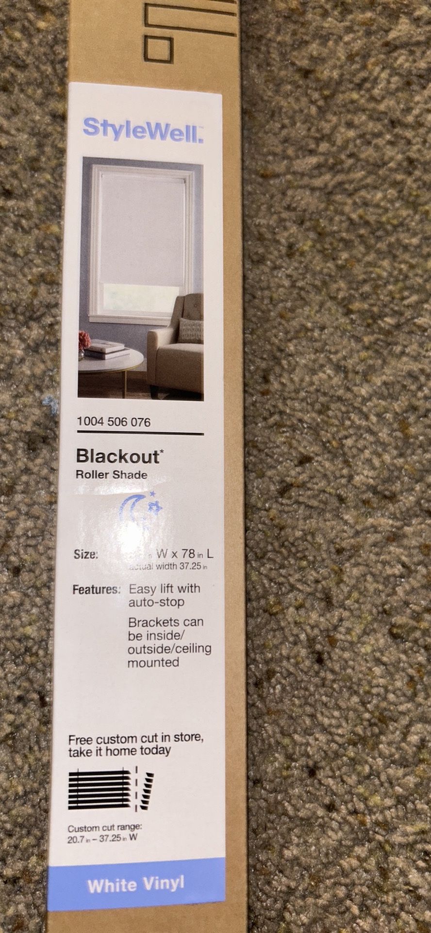 Cut to Size White Cordless Blackout Vinyl Roller Shade 37.25 in. W x 78 in. L. New in box. Brackets can be installed inside/outside/ ceiling mounted. Have several. Will make deals for multiples.