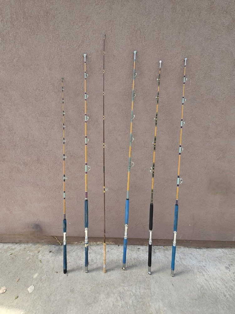 Vintage Fishing Rods. See individual pricing below. From left to right: (1) 72" Varmac LW1. $100 #195C Line Test 8 - 20 Colors: Blue grip Purple above grip Joint may have slight crack **SOLD**(1) 79" Varmac RS3. # 50 lbs Roller guides: Aftco Colors: Blue grip Maroon above grip Bought new from Bisbee's, the Sport Fishing Headquarters, in Balboa Island, Newport Beach. (1) 84" Hardy (England). $200 Spinning Fishalite 215 cm / mesh 360 Color: Tan cork grip Brown above grip (1) 80" Varmac RS3. $150 Roller guides: Aftco Colors: Blue grip Teal above grip **SOLD**(1) 78" Varmac RS2. Bounty Hunter/ R. D. W. IGFA 30 LB Roller guides: Aftco Colors: Black grip Green above grip **SOLD**(1) 79" Varmac RS2. #30 Roller guides: Aftco Colors: Blue grip Purple above grip Bought new from Bisbee's, the Sport Fishing Headquarters, in Balboa Island, Newport Beach. Additional photos available. I am posting this for the family of my dad's late friend. They do not have any additional info about the rods but they could be Sabre Blanks. I have other fishing and boating items available including lures, gaffs. fenders, dock lines, rub rails, power cords and adapters. If you follow me on this app or click my profile icon, you can see the items I have for sale. Cash only. No shipping available. Item to be picked up at my location in Sunset Beach, which is a part of Huntington Beach. Selling as is, as shown. Shows signs of use, mainly on the grip. Zoom in on the photos. Needs cleaning. Previous owner's initials written on some rods. I am Plan to inspect fully before purchase. No refunds. Selling first come, first serve. casting, casts, cast, float, floats, floating, lures, lures, wood, wooden, plastic, metal, metals, aluminum, carbon fiber, graphite rods, white, blue, black, grey, gray, tan, beige, brown, silver, chrome, stainless steel, gold, yacht services, yachts, yachting, boat, boats, boating, ship, ships, vessel, vessels, nautical, rig, rigs, rigging, beach, beaches, ocean, oceans, bay, bays, lake, lakes, river, rivers, dock, docks, dockside, salt water, offshore, saltwater, freshwater fishing poles, fly fishing, pole, fishing equipment, sports and outdoors, sportsmen, made in USA, replacement, replacements, grip, grips, handle, handles, hook, triple hooks, sinks, sinking, fins, bass pro shops, tackle, bait, chartreuse, iridescent, florescent, fluorescent, trolling, trolls, sportfishing, ultralight, ultra lightweight, bamboo, corks, muskies, musky, bluefin tuna, salmon, halibut, swordfish, seabass, rainbow trout, yellowtail, yellow perch, big game, fishing line, lines, spools, rollers, guide, eyelet, eyelets, angling, armac, rs 2, rs 3, 1950s - 1970s, The House of Hardy, reel seat