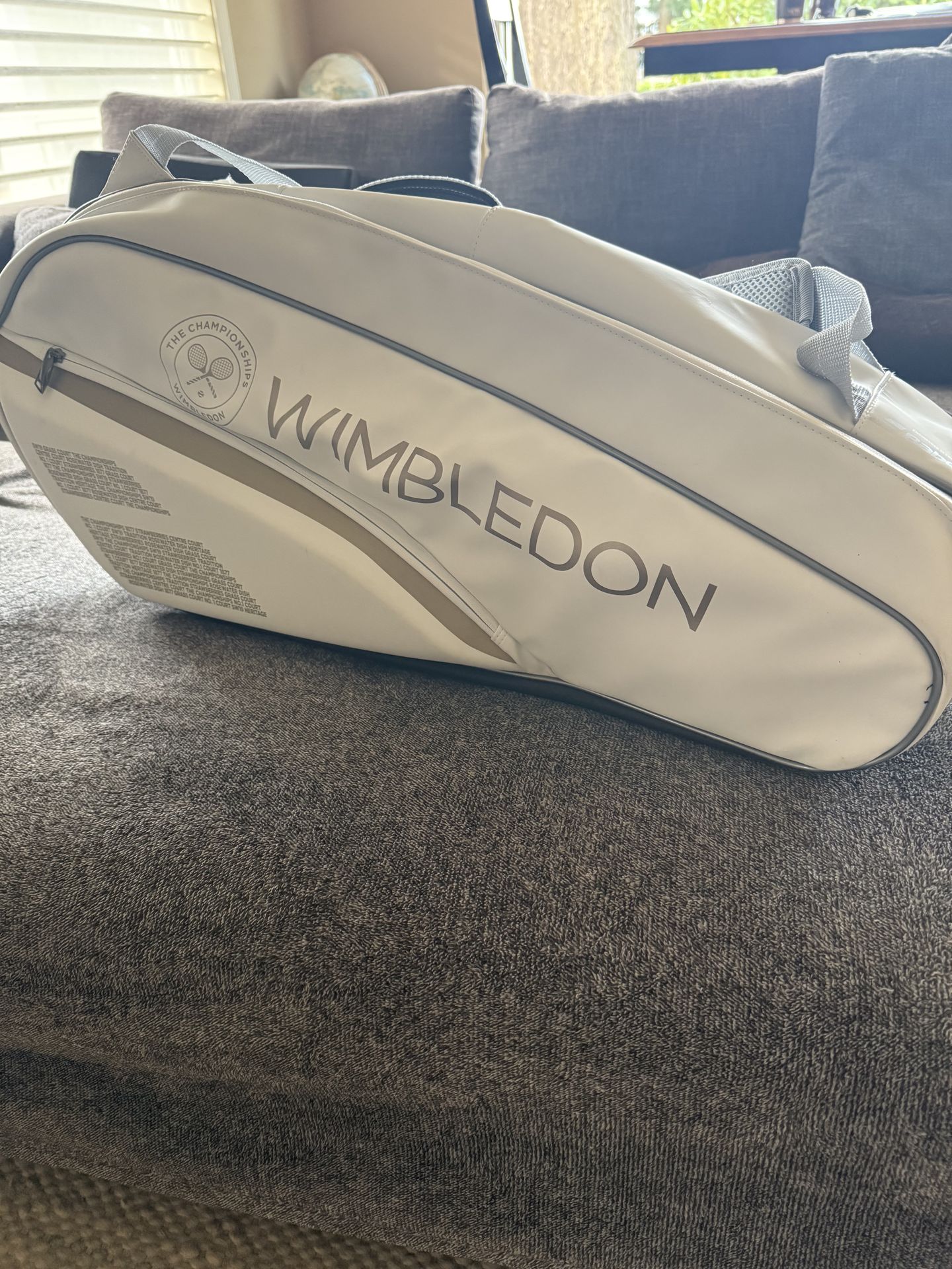 Brand new - classy and unique. Holds 6 rackets. Multiple pockets for personal belongings. Shoe sleeve.