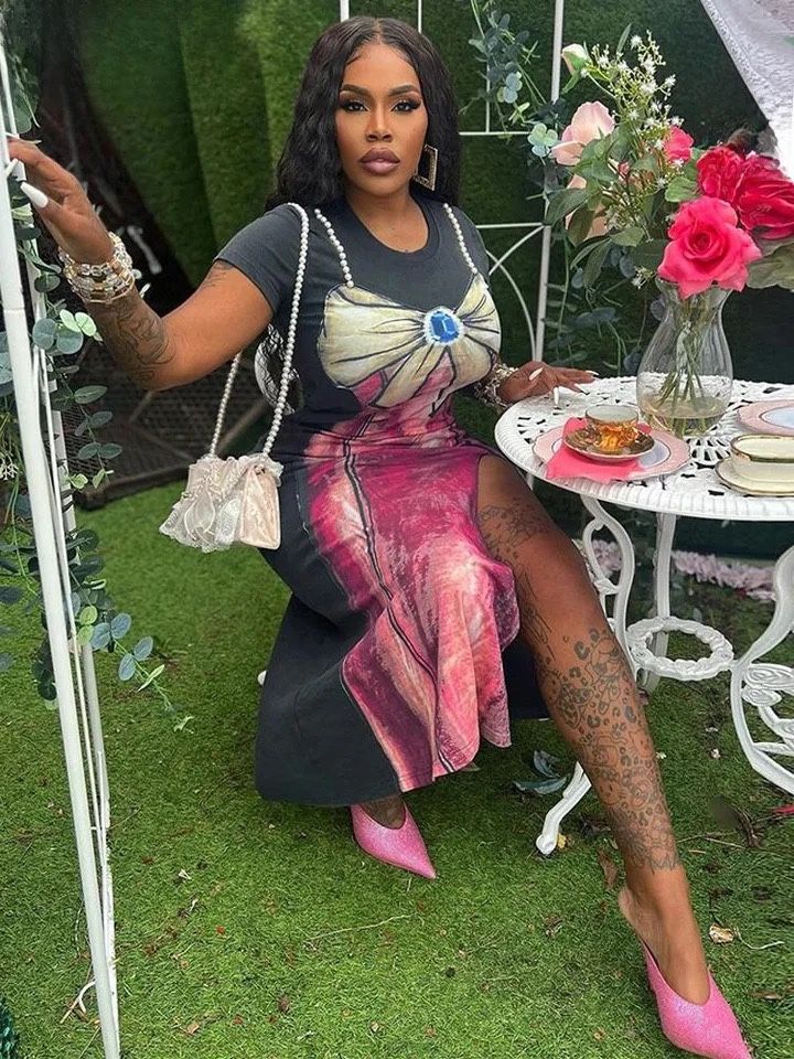 Iamdoyleyboutique: Puss Flower Appliques Dress Woman Summer Sexy Splits Sleeveless Available In Large