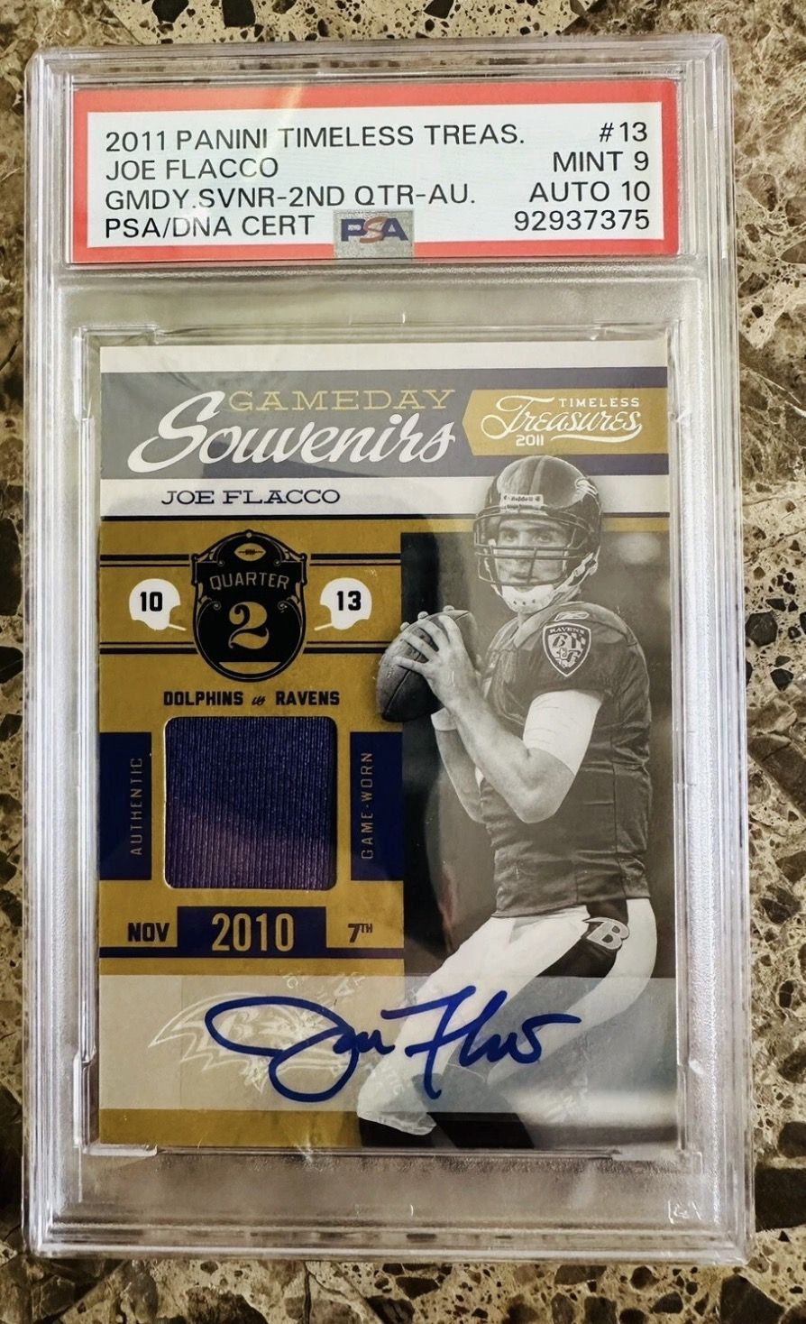 Available on E (BAY) only Up for sale is an incredible 2011 Panini Timeless Treasures Gameday Souvenirs Joe Flacco Auto Patch #5/5, graded PSA 9 (Auto 10) with PSA/DNA certification. This card is serial numbered 5/5, making it the final copy produced — and it perfectly matches Joe Flacco’s jersey number #5, adding a huge level of eye appeal and collectibility for Ravens fans and serious collectors. Even better, this card is a PSA Pop 1, making it extremely rare The patch is authentic game-worn material, and the card even specifies the exact game it came from: November 7, 2010 – Dolphins vs. Ravens (2nd Quarter). You don’t just get a game-used patch — you get one tied to a specific NFL game. ✔️ PSA 9 Card Grade ✔️ PSA 10 Autograph ✔️ Serial #5/5 (Jersey Match) ✔️ Pop 1 ✔️ True Game-Used Patch (Game Identified) High-end Flacco pieces like this don’t surface often. A premium Ravens collectible with real scarcity
