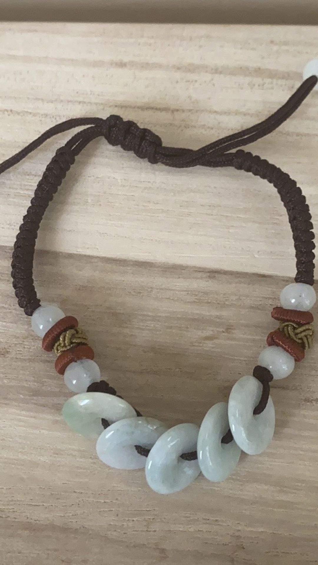 Natural A-grade jade and color, five hand-carved jade donuts. Green bracelet stitched with silk thread. Bracelet size can be adjusted. Handmade unique jade bracelet. Lucky jade carving bracelet. $$All sales are final. Cannot be returned or exchanged. Bundled sales are accepted. More discounts. Please leave a message.