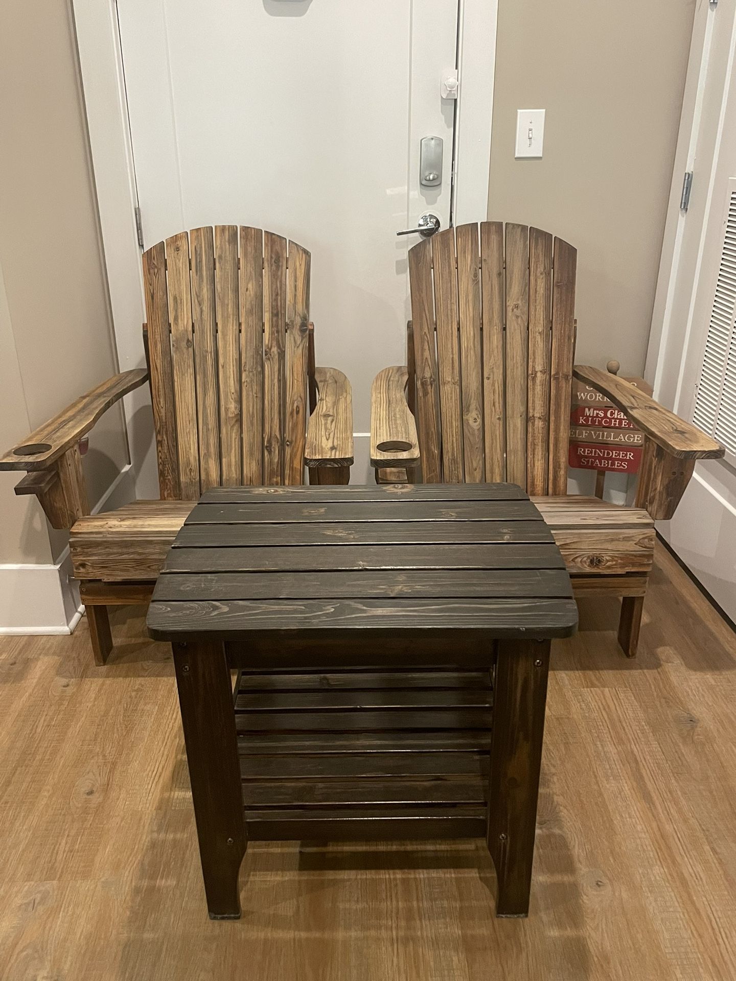Used in very good condition. Have barely been used. 100%wood. The set 2 chairs and the table can be used for patio,deck, balcony. All sales are final, price is negotiable