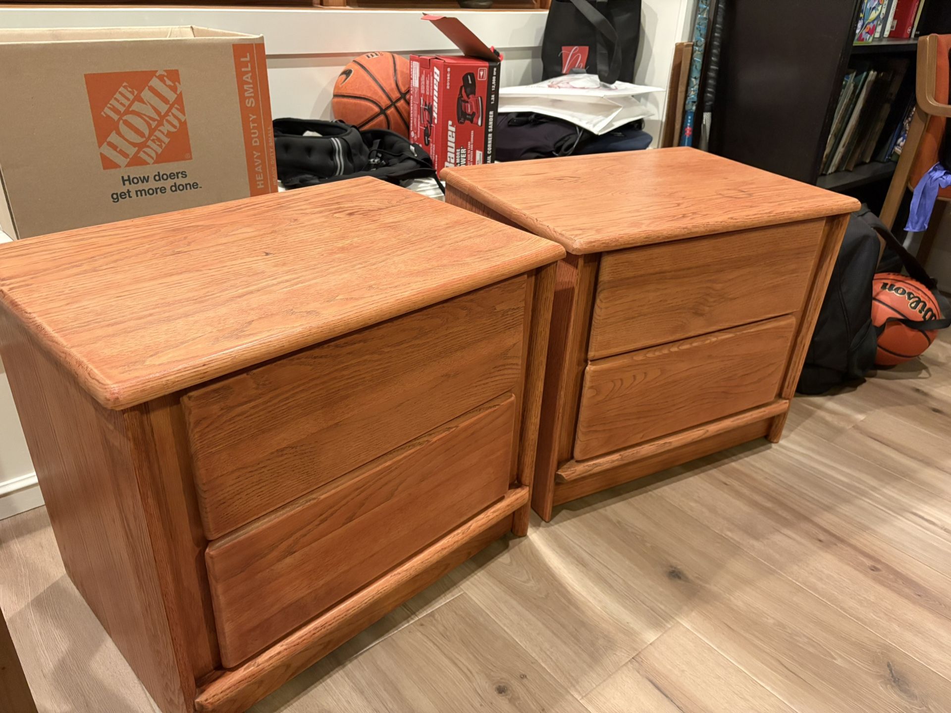 $60 each or $100 for both! Two real wood end tables. Has some wear and tear, one of them has a water ring stain and one of its drawer has water damage. Some chipping here and there but overall very sturdy. Heavy, maybe about 30lbs each. Has a cherry, reddish stained tint.