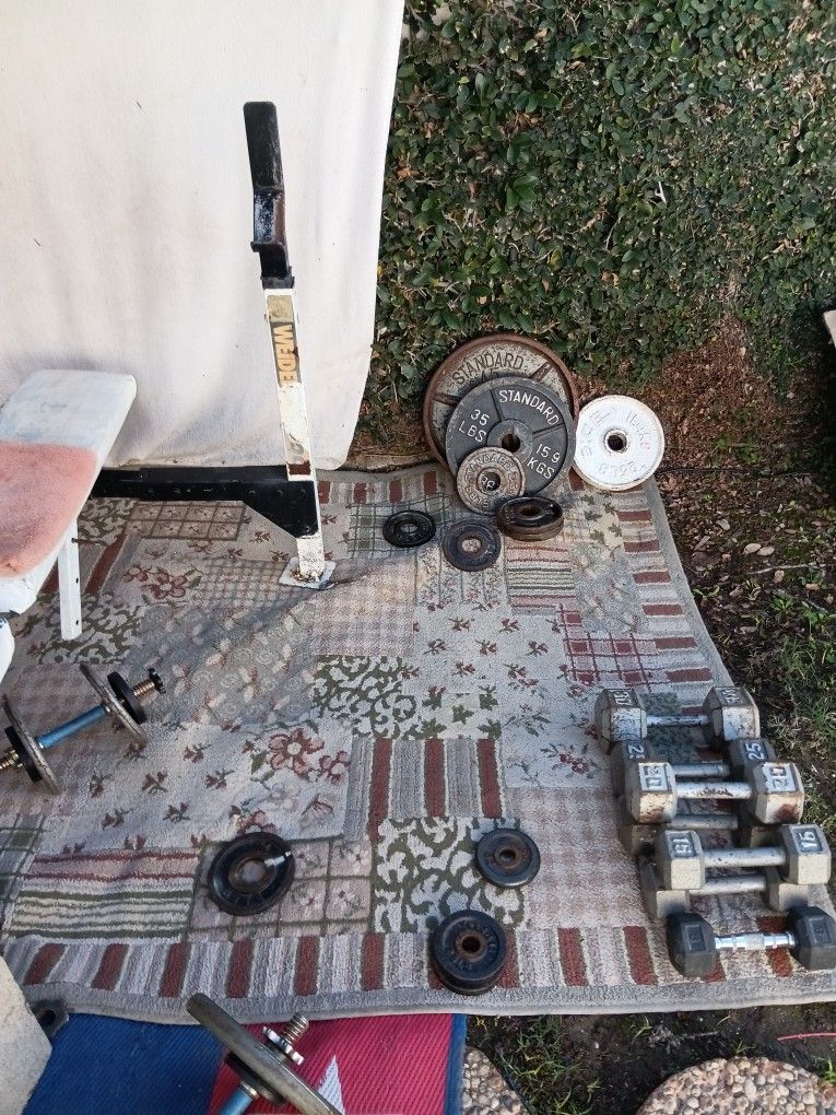 2-45's 2-35's 6-25's 2-10's 4-5's 2-1/2's 2-2.4 pnds 2 Olympic bars $40 each Small Olympic bar $20 Dip station $35 Squat station $35 Bench with blue tape $15 White bench $20 DB's pair 5's pair 8's Pair 15's Pair 20's One 25 One 30 1 inch weights adjustable DBs 2- 25's. 1 inch hole Cable pulley with everything that goes with it $25 The Umbrella $45 There's rust on some weights from rain and such but they will give u the same results as fancy expensive brand new weights.