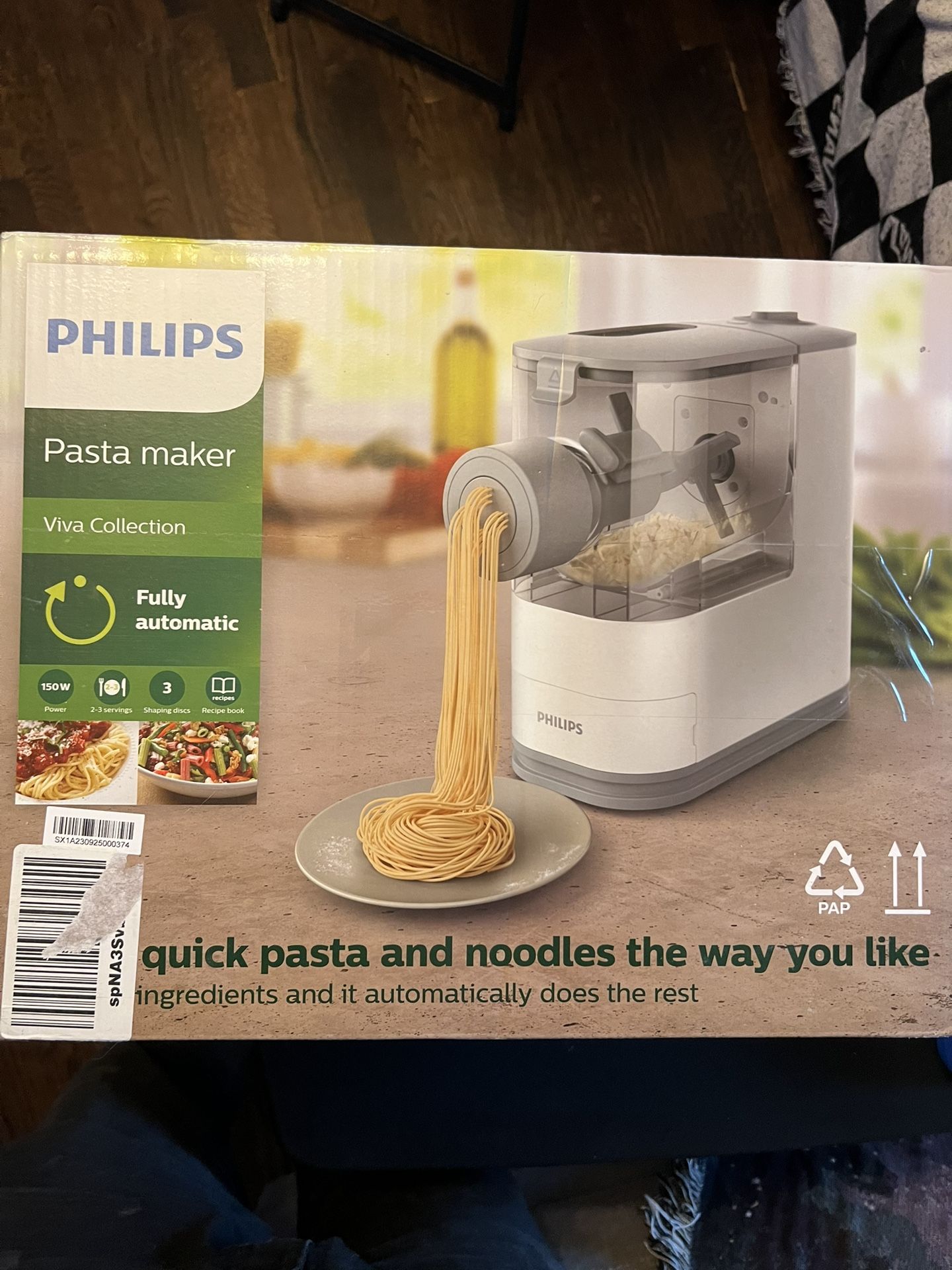 New in the box never opened Automatically kneads and extrudes 2-3 servings of fresh pasta in just 18 minutes thanks to uniquely designed stirring bar. Cord length : 40 Inches With the machine there are 3 default classic shaping discs for Spaghetti, Penne and Fettuccini. The special shaping discs enable a double extrusion process to assure smooth pasta and noodles consistently By using different flour and adding different ingredients like egg, herbs or spinach and carrot juice, you can make various types and flavors of pasta Space saving design allows you to keep it out on the counter for everyday use Smart built-in storage for shaping discs