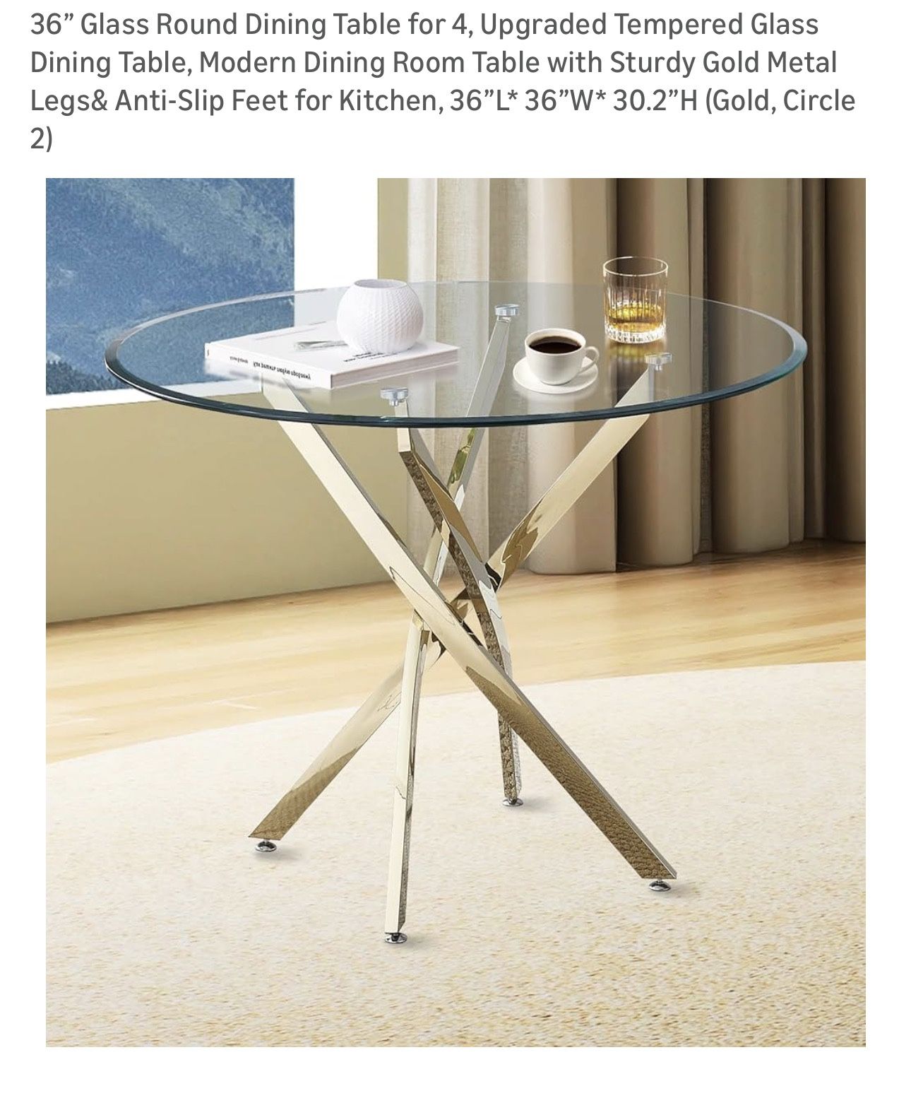 Features: • Diameter: 36 inches (91 cm) • Height: 30.2 inches (77 cm) • Tabletop material: Tempered glass • Base: Sturdy gold-finished metal legs • Anti-slip feet for extra stability 🪑 Seats up to 4 people — great for cozy breakfasts, meetings, or stylish dining moments. 💫 The clear glass top visually opens up the space, while the gold metal base adds a touch of luxury and modern charm. 📦 Condition: Excellent, like new — gently used, no scratches or chips.