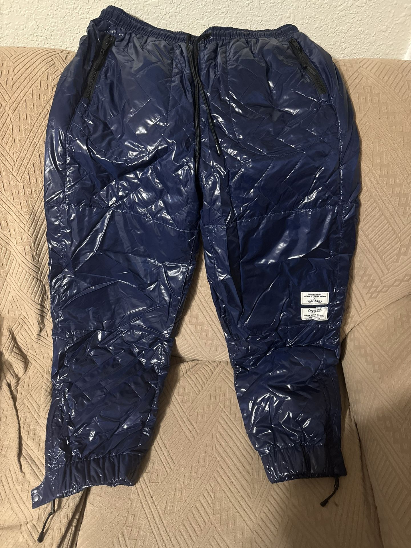 Men’s Size- Medium Quilted design in Medieval Blue Elastic waistband with drawstring Zip pockets on front One back pocket White co-branded patches on left knee Elastic cuffs Crafted in PrimaLoft® for extra warmth