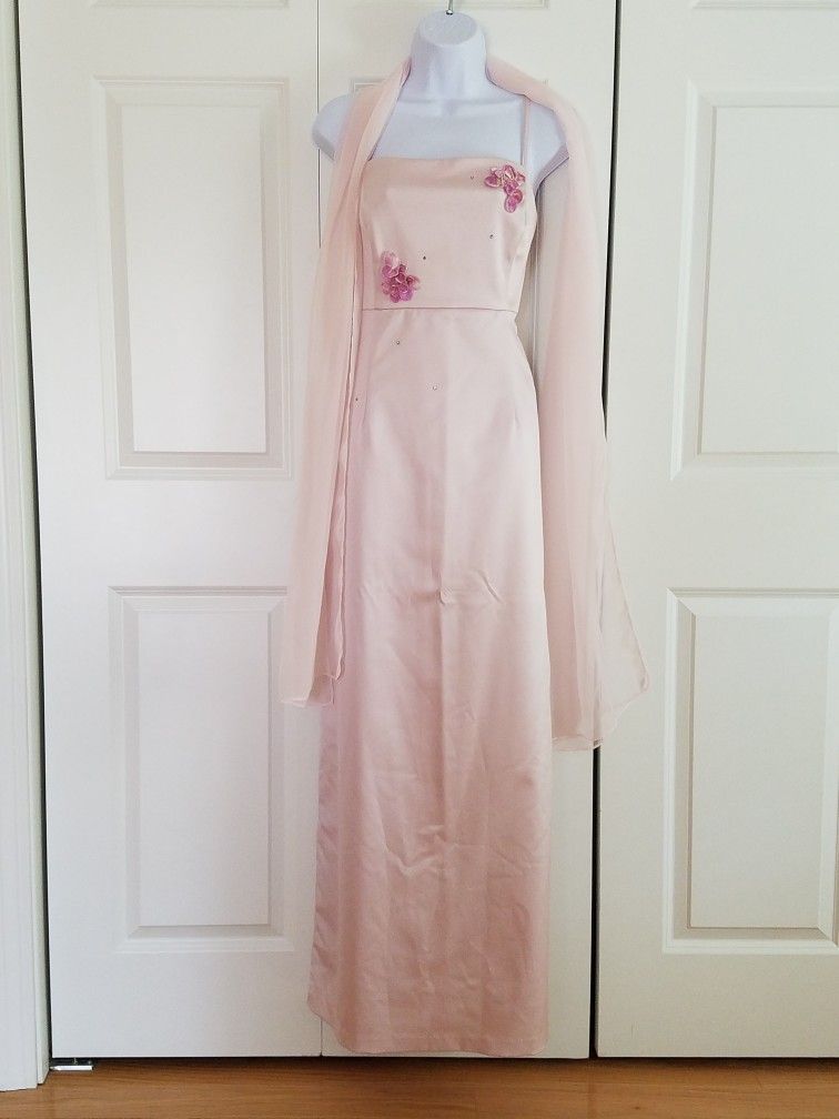 ***Firm Price *** Women's long, light pink dress, size 6, comes with a shawl; dress has a side slit coming up to mid thigh.