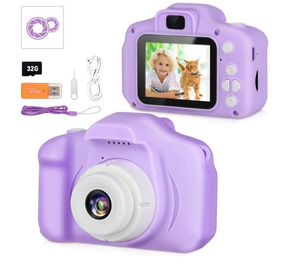 New never used 【Creative Camera Toy Gifts for Kids】Perfect birthday, christmas, festival gifts toys for 3-9 years old boys and girls. This Kids Camera for Children is the best toy as child’s gift,it has not only photography function,but also 1080P video record,as well as several digital games options. 【Multi-functional Kids Camera】Dual lens kids cameras and camcorders comes with more functions include photo capture, take selfies, video recording, playback, delay capture, Game Play and date setting. Comes with 5 games which brings more fun for childs. 32GB High Capacity, allows to store thousands of photos.Include a portable lanyard hang, easy to carry and moving. 【Child-Safety Materials Camera】 This camera is used high quality non-toxic soft ABS,more safe and comfortable for children’s skin. Shockproof shell provides effective anti-fall protection. 【12 Mega Pixels and 1080p HD video 】kids camera is equiped with 12.0 mega pixels, auto Focus and 1080P HD IPS Screen. 28 Frames and 11 Filters can be chosen, children can take photos with frames, leave some funny photos with family or friends. It is sure to bring an unforgettable and beautiful experience to their childhood. What You Get - Kids Camera x 1, 32GB TF Card x 1, USB Charging Cable x 1, Card readerx 1, Card pin x 1, Lanyard x 1, User Manual