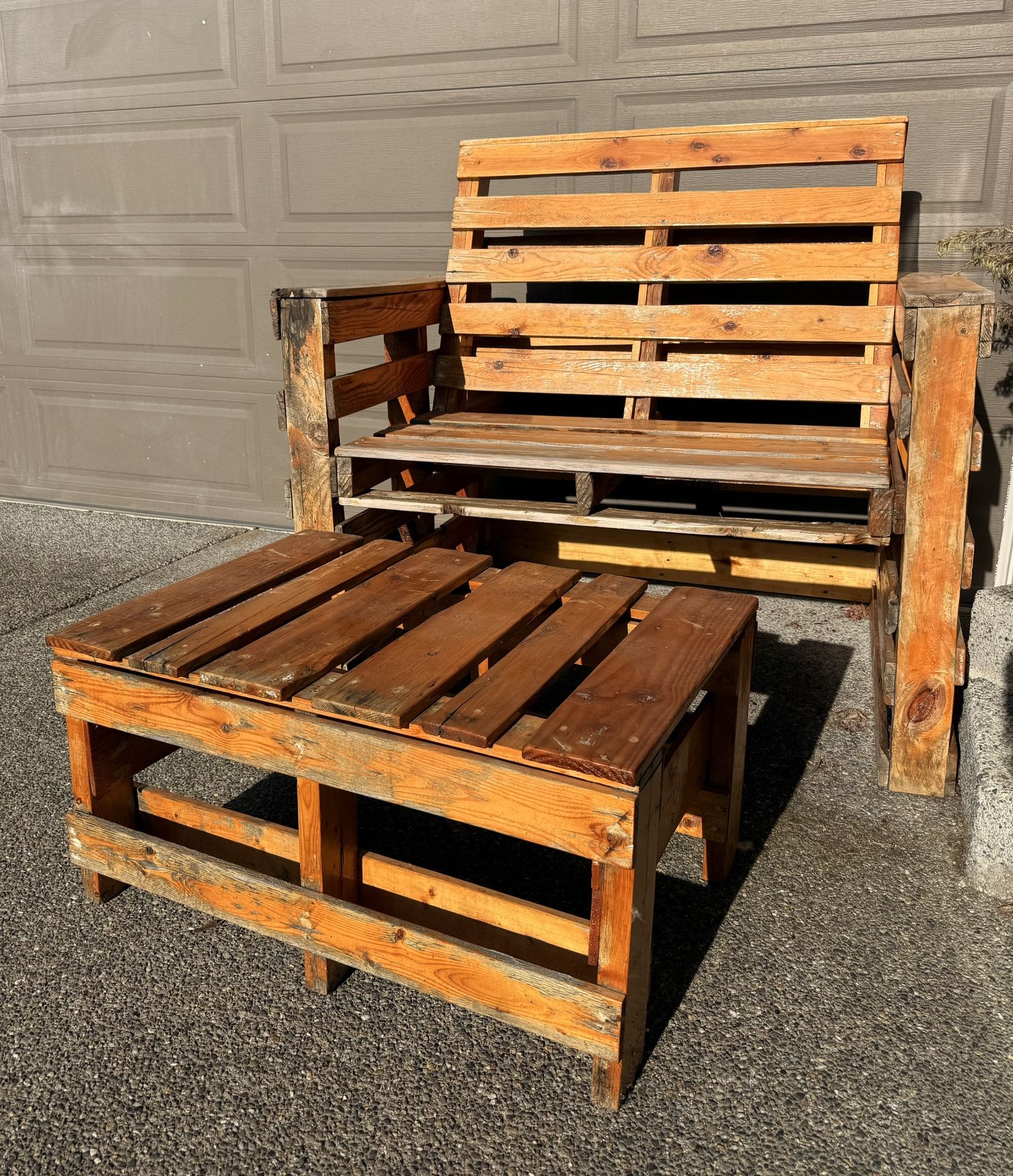 Handmade bench and ottoman (table)* Very sturdy and solid Comfortably sitting 2 adults or 3 kids. Satin clear cover to protect from elements. (May need to touch up and re coated. Ottoman can be stored under the bench for space saving *Pillows not included.
