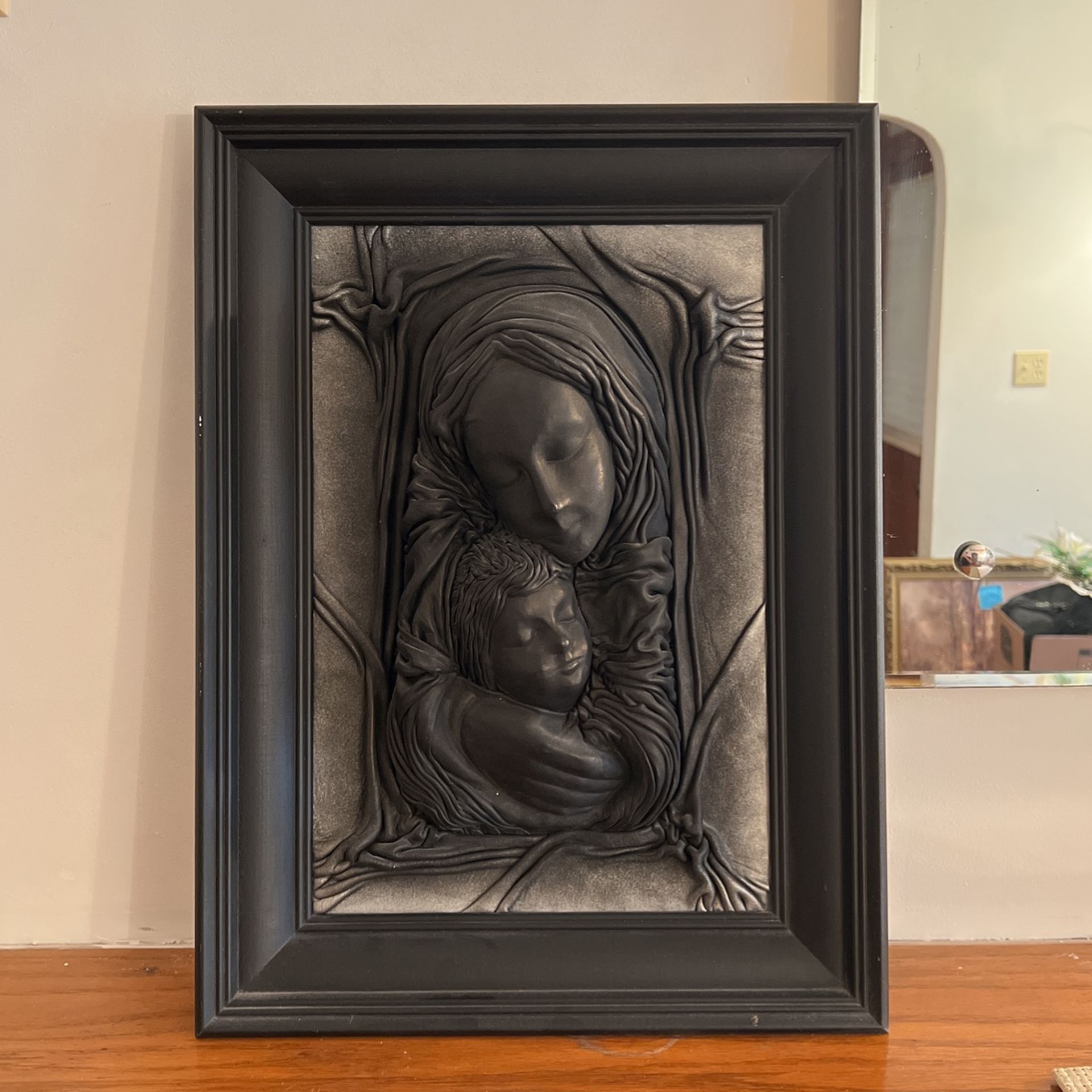 Leather and framed Mary and baby Jesus. First 30 dollars takes it. First come first serve. Very unique!