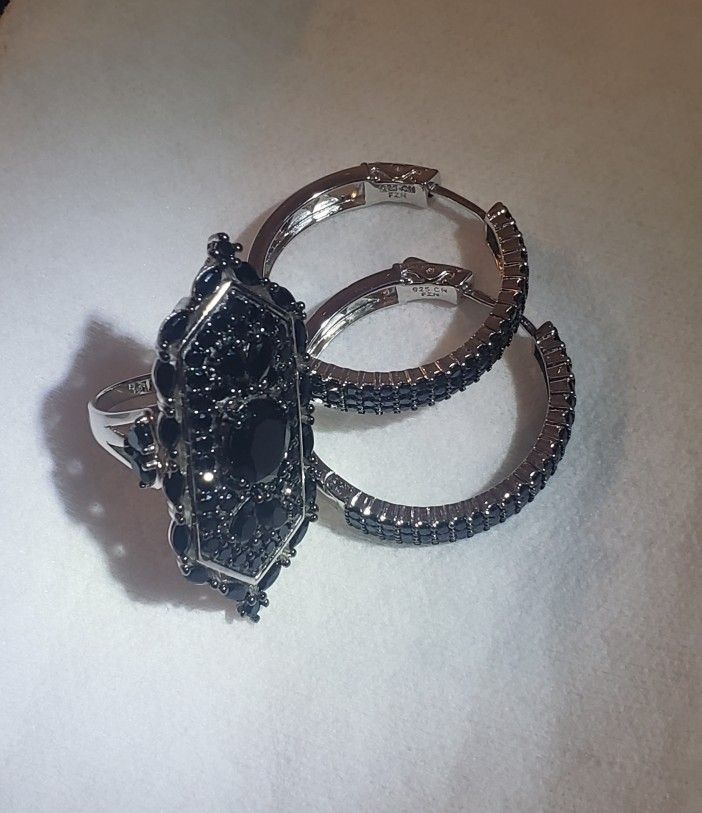 Black Spinel, Rhodium over Sterling Silver Ring 5.96ctw. Measures approximately .81"L x 1.63"W. Size 6 Brand New. Has never been worn. Comes with beautiful matching hoop earrings. This beautiful black spinel ring is a must-have for any occasion. The gemstone has a natural creation and is set in rhodium plated sterling silver. The oval, pear, and marquis shaped stones have a total carat weight of 5.96 ctw. The cluster style ring is perfect for those who love vintagage jewelry. The color of the stones is black, and there are no secondary stones present. This high-quality piece of jewelry is sure to impress anyone who sees it. Offers Welcomed!!