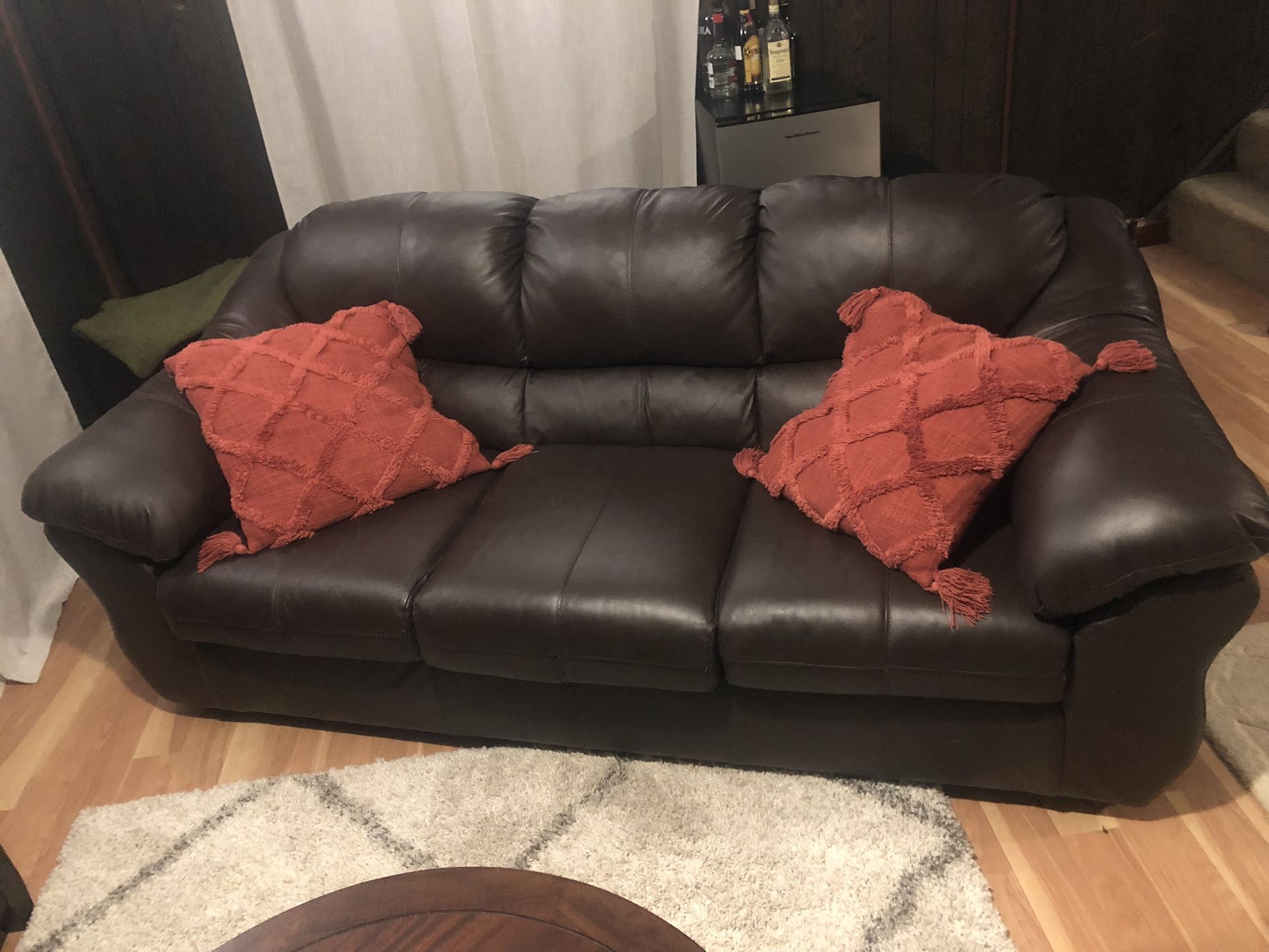 Brown genuine leather couch. Like new condition! Has been stored in basement. Does not recline. Smoke free home. Will need to bring someone to help carry up from basement. Only serious buyers comment please!