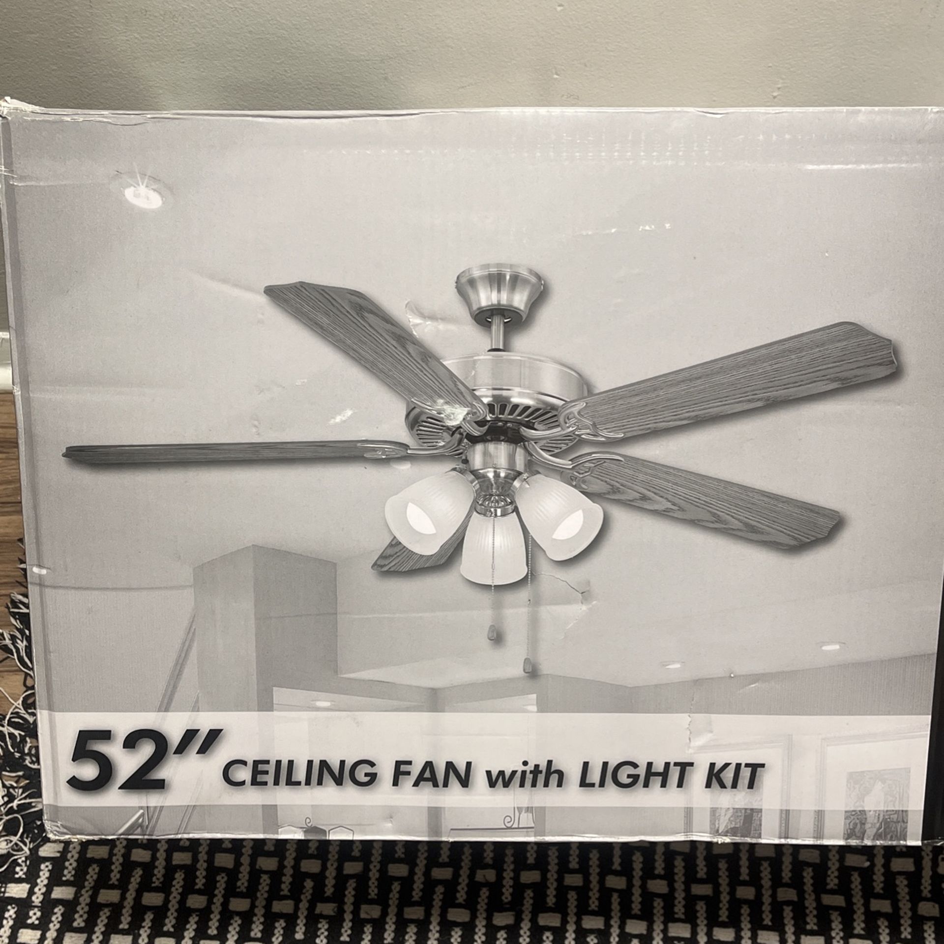 Brand new in the box ceiling fan with light kit Model # 162090L Satin nickel finish 3 lights w/ frosted glass 5 reversible blades 3 speed reversible