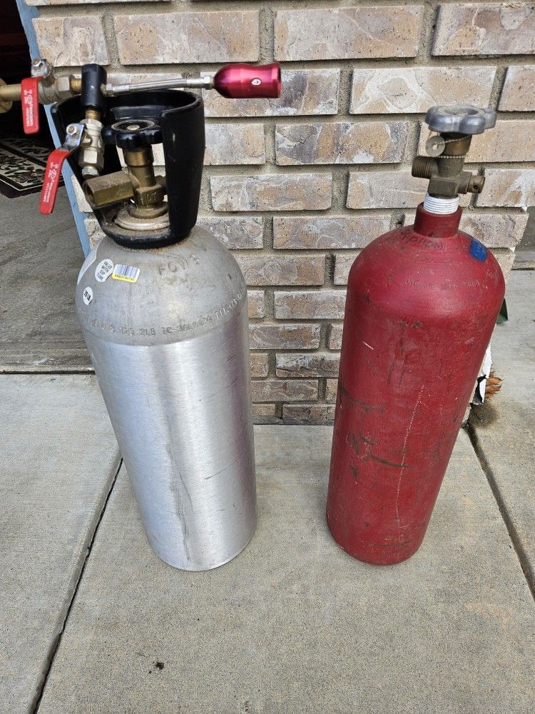 Two CO2 cylinders for sale one aluminum with the dip tube includes SodaStream cylinder refill valve assembly.