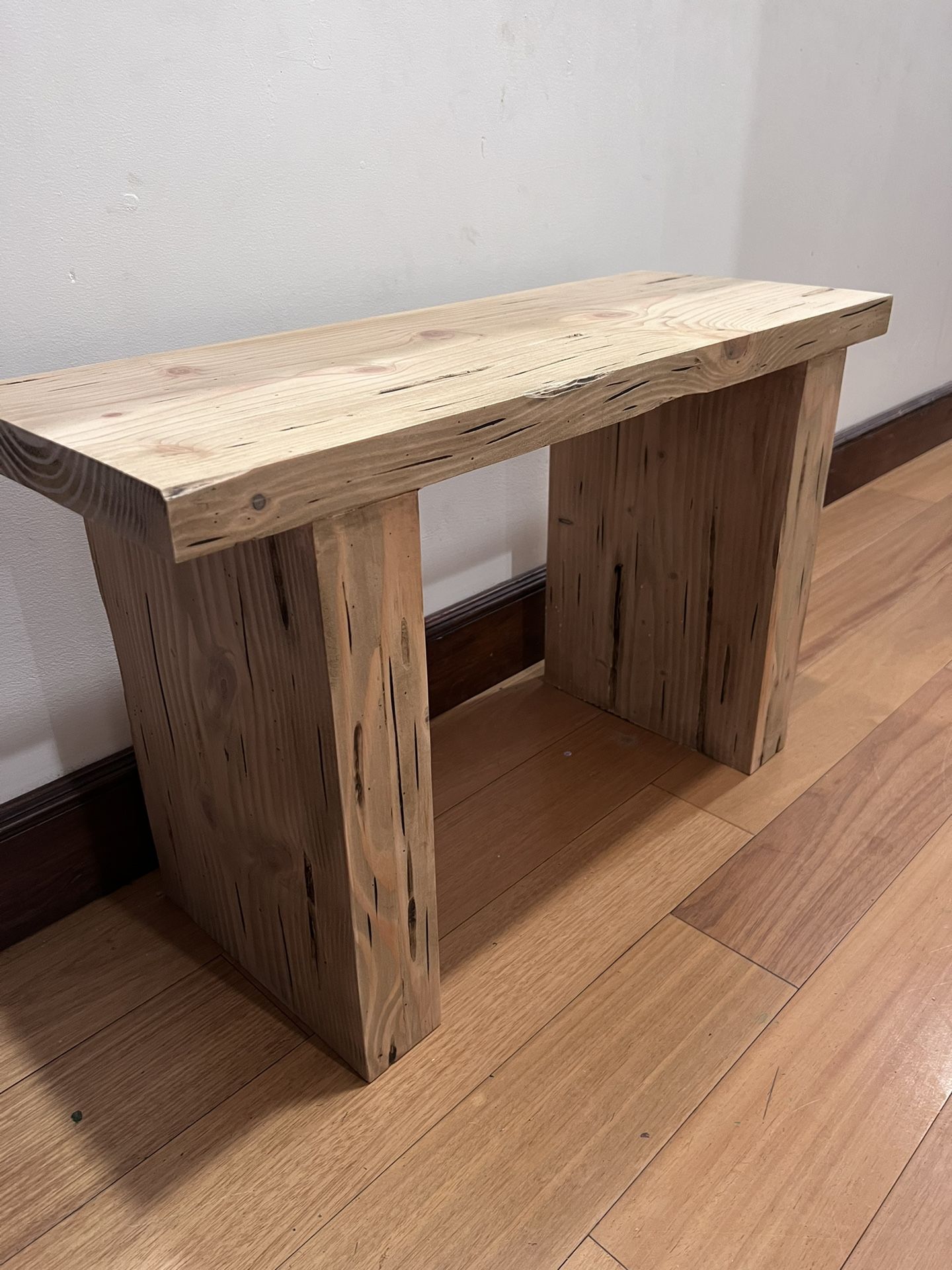 Dimensions: 30” W x 11.5” D x 18.5” H Handcrafted wooden bench that serves as a seat, console, or end table. It has been distressed, stained, sealed, and antiqued to provide a timeless rustic look. Other colors and sizes may be listed or made to order. Delivery available to Greater Los Angeles with a $75 deposit.