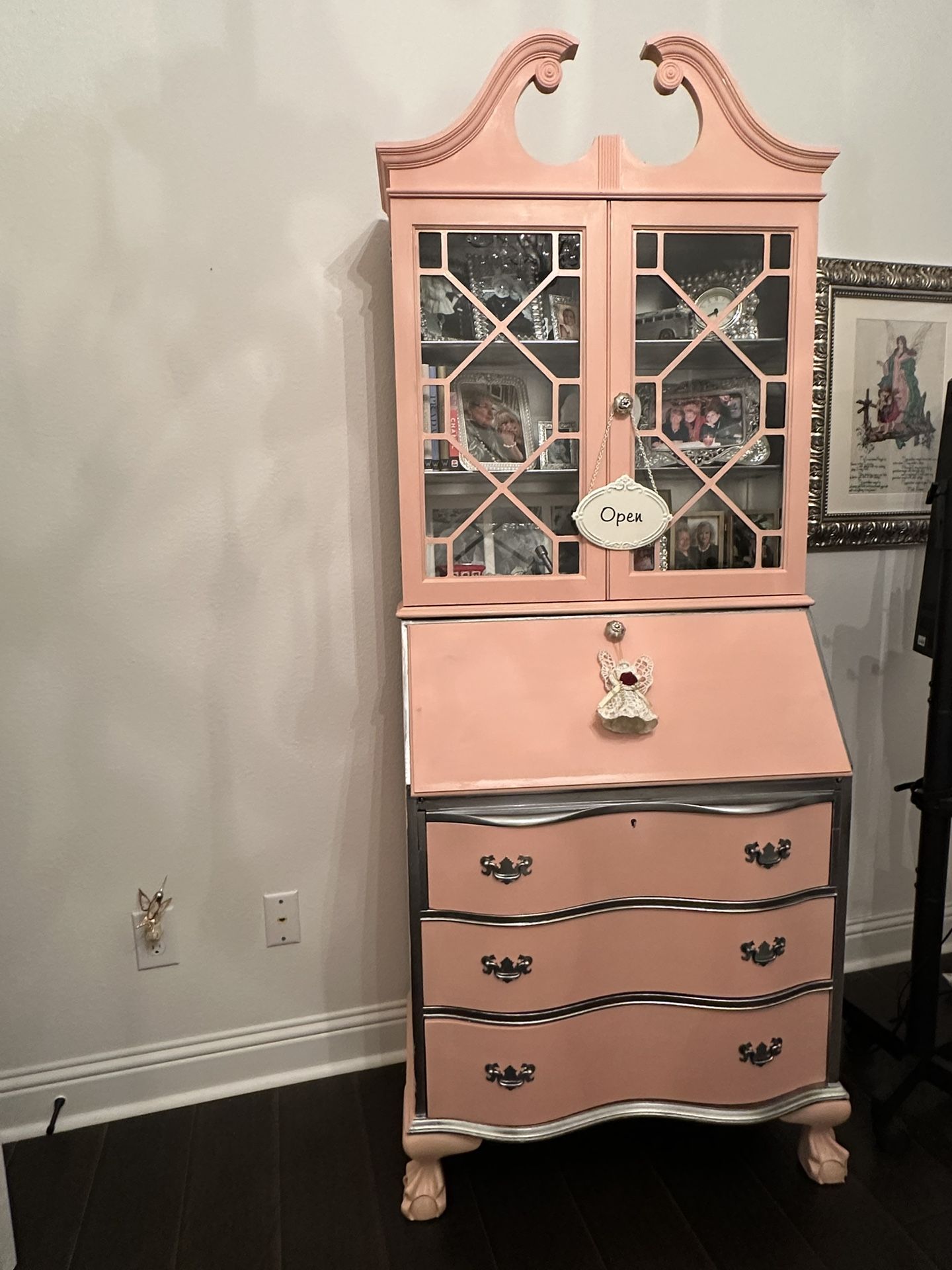 VINTAGE SECRETARY 30” Wide, 15” Deep, 76” Tall Beautiful chalk painted coral/ pink secretary. All drawers work. Perfect for an office, nursery or gurus rooms. Pick up Rockwall ASAP Bring helpers. We cannot load. Thank you!