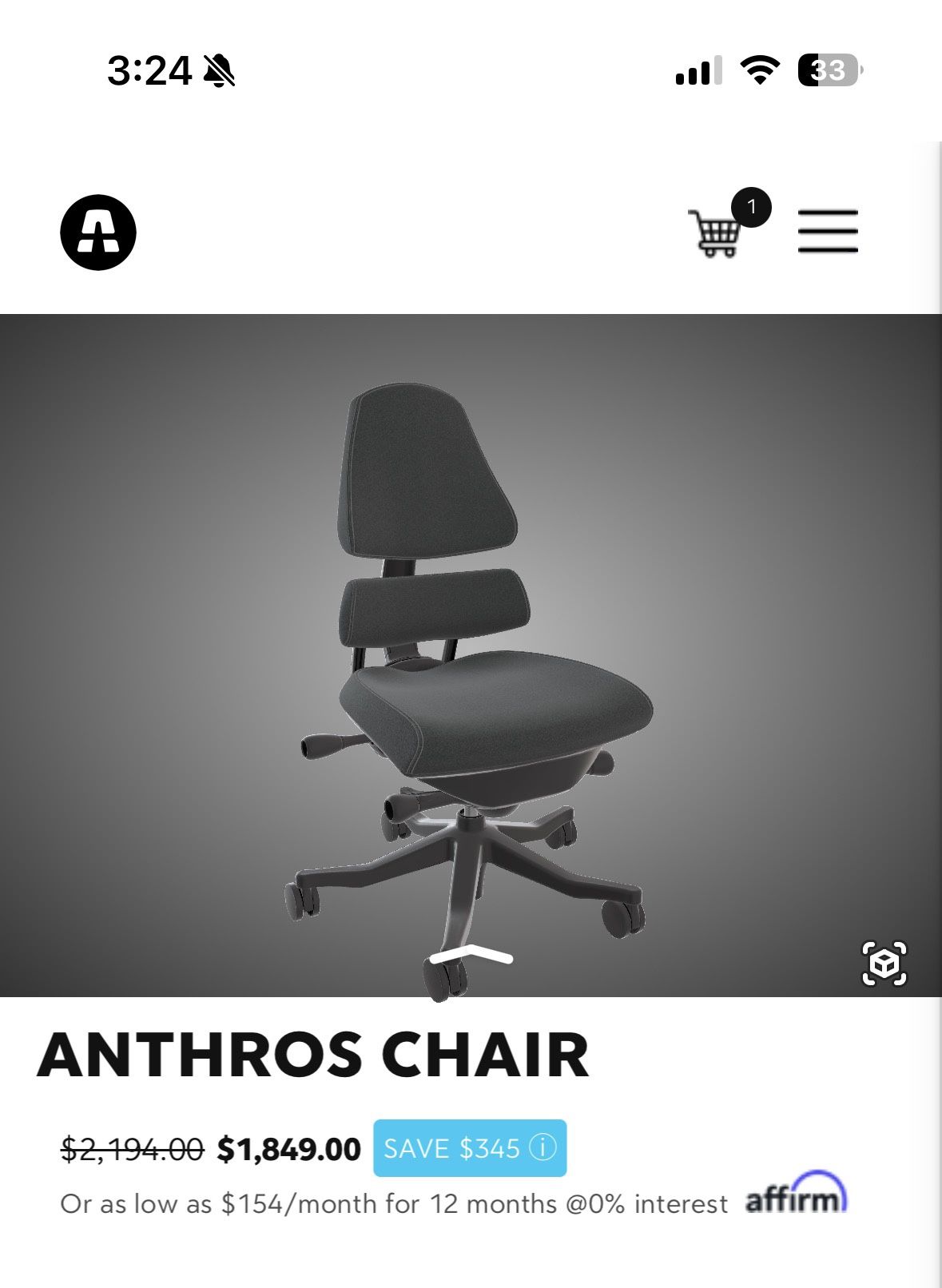 Anthros V2 Chair; Onyx Steel Athlon Skeleton 5 Spoke. Used less than 2 months, still have the original packaging and can take apart/pack it up for you. This chair fixed my posture but I really wanted a headrest and got another chair. I missed the return window so here i am haha