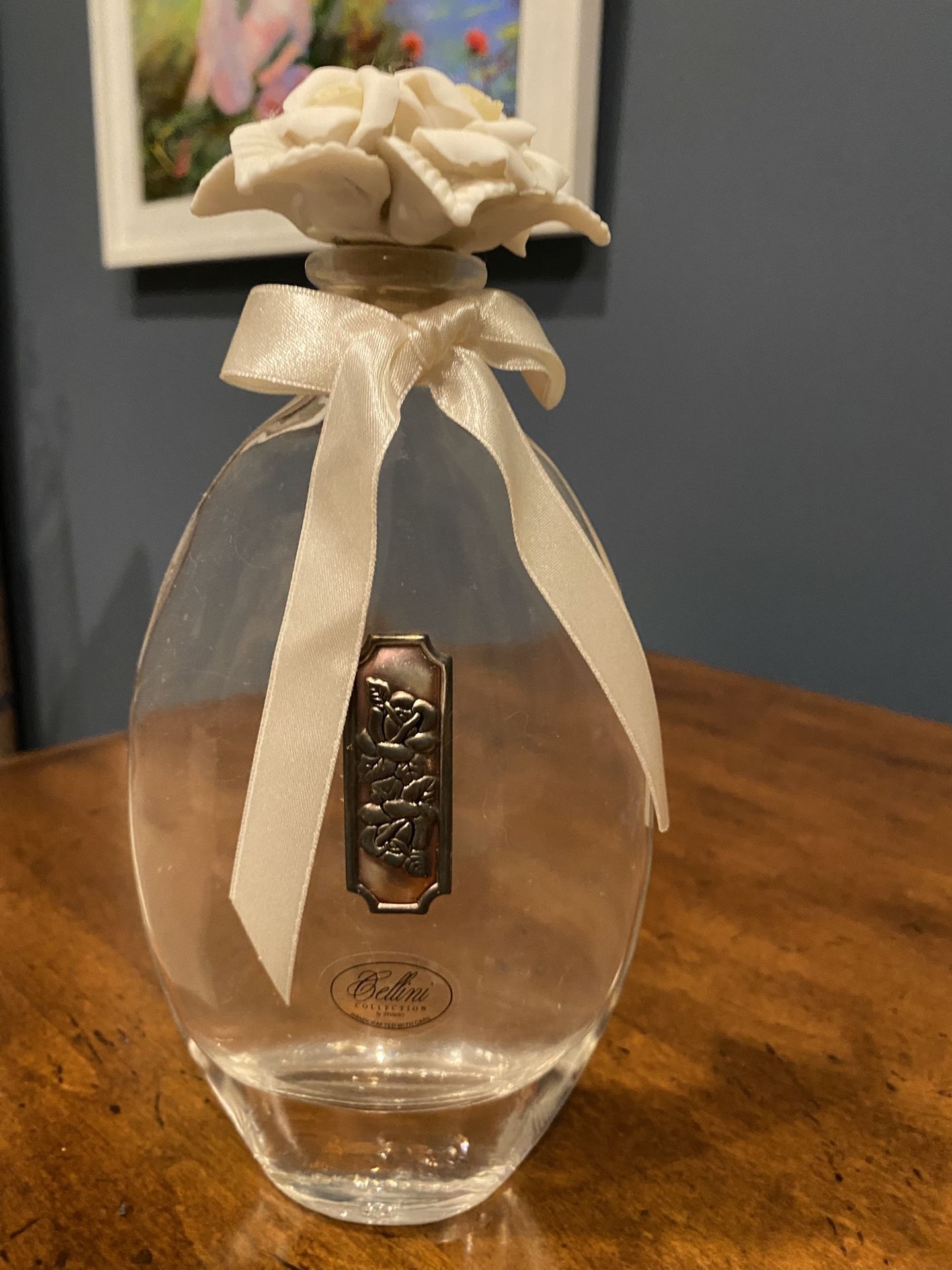 Cellini Vintage Glass perfume decanter with Porcelain ivory detail top, and silver plaque on front