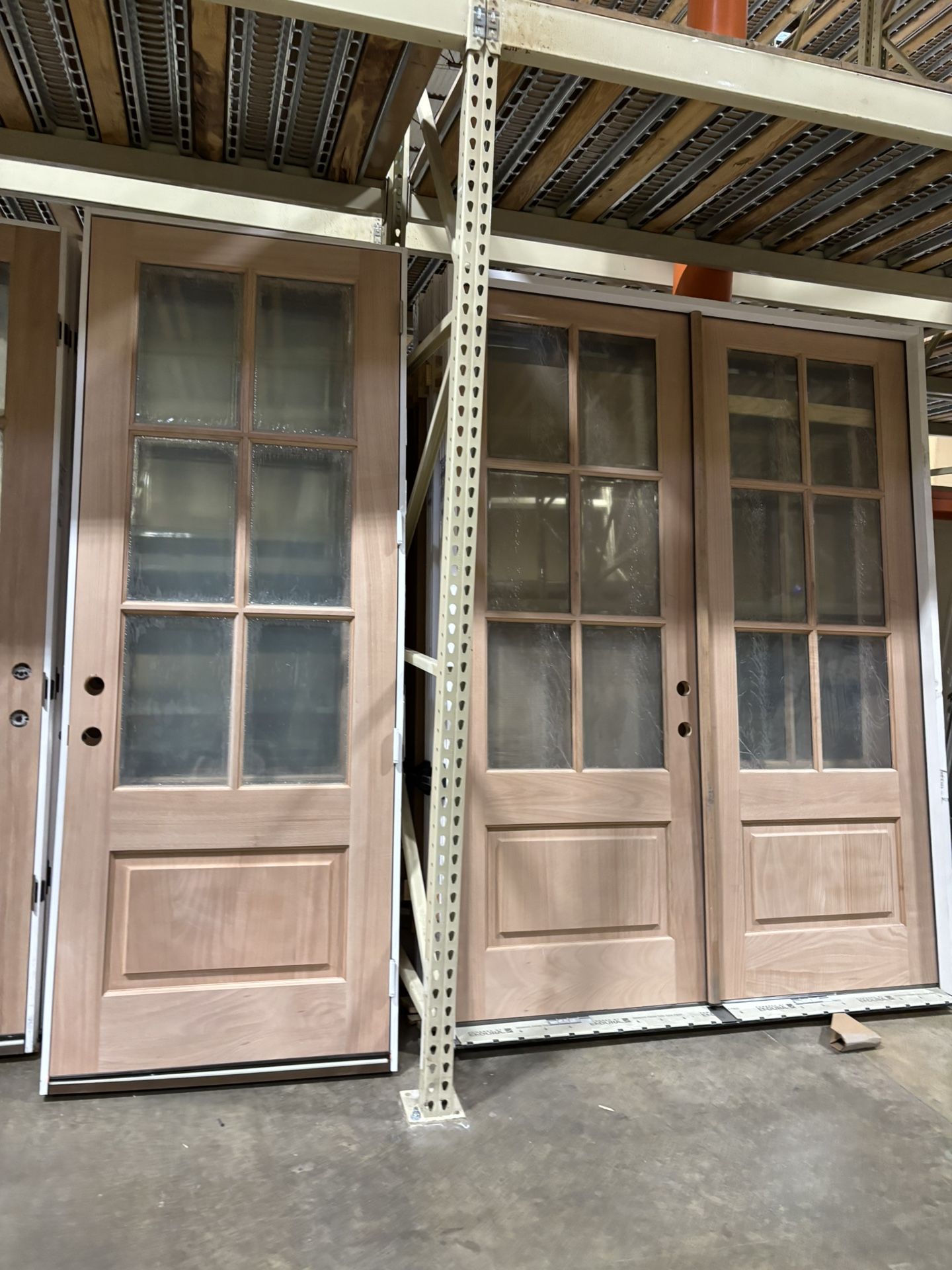 Mahogany Wood exterior doors Prehung with frame Satin nickel hinges Double glass Styles available: 3 lite modern frosted glass 4 lite traditional rain glass 5 lite modern frosted glass 6 lite traditional rain and clear glass Sizes available: 36x80: $699 36x96: $799 72x80: $1399-$1499 72x96: $1499-$1699