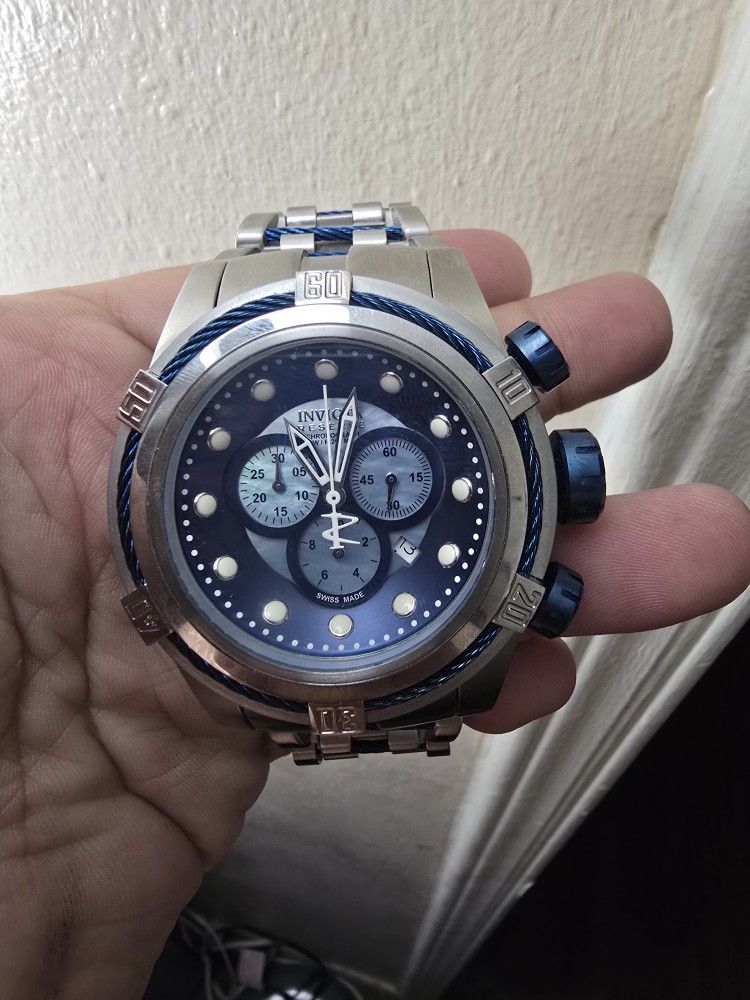Invicta Bolt Zeus in silver and blue. Needs battery. Comes with 6 slot case