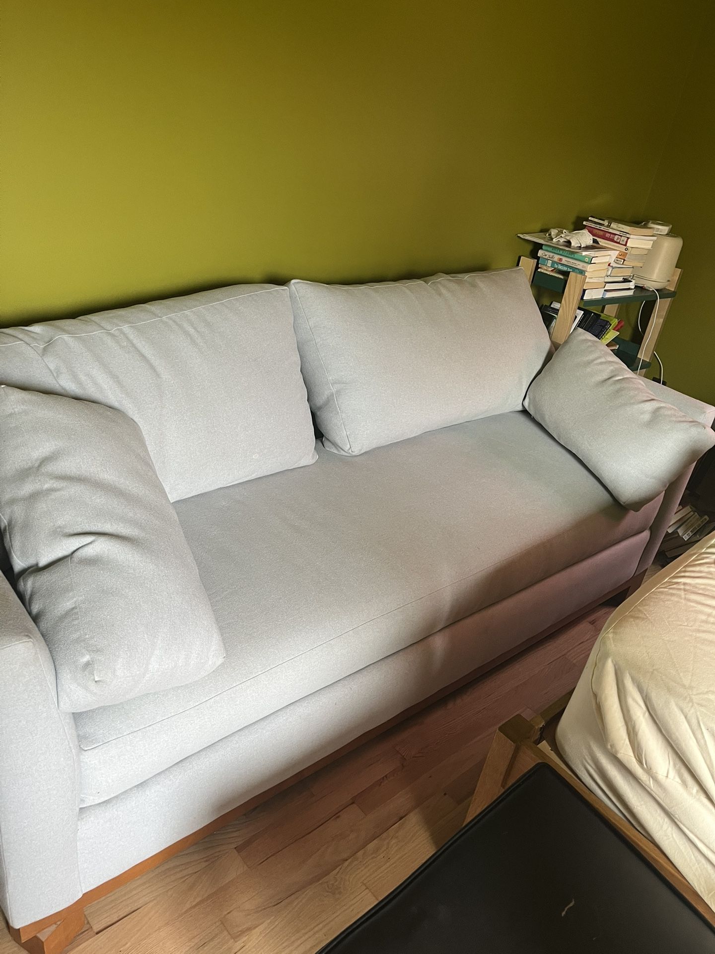 Sky blue sofa that pulls out into a bed. Well made, very durable and very heavy. 36 in deep 78 in long 31 in high Bought after the fires in Altadena while we waited for our new couch to arrive. Not impacted by the fires !