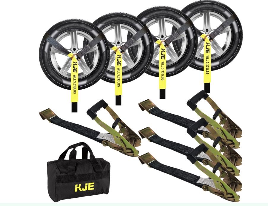 KJE 4 Pack Car Tie Down Straps For Trailers - Tire Ratchet Strap With Flat Hooks - 2" X 10' 10,000LBS Break Strength - Lasso Style Wheel Straps For Hauling UTV, SUV, Any Cars New Retails $69.99 Asking $50 Ref#M1624