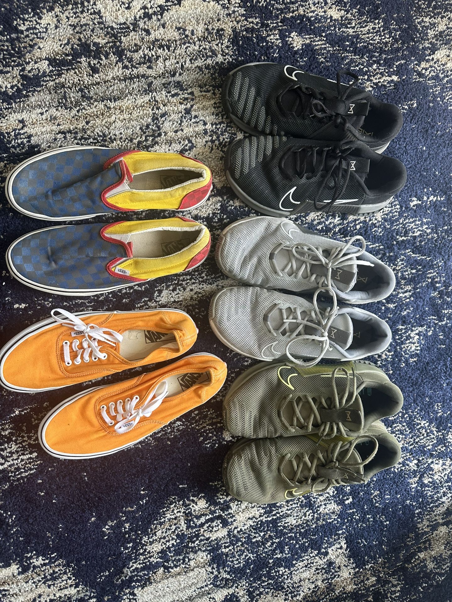 Size 11.5 Men’s Nike Metcon: Grey and Forest green - $30 each, Marigold Vans - $30 Size 11 Black Nike Metcon -$30 multicolor Vans - $15