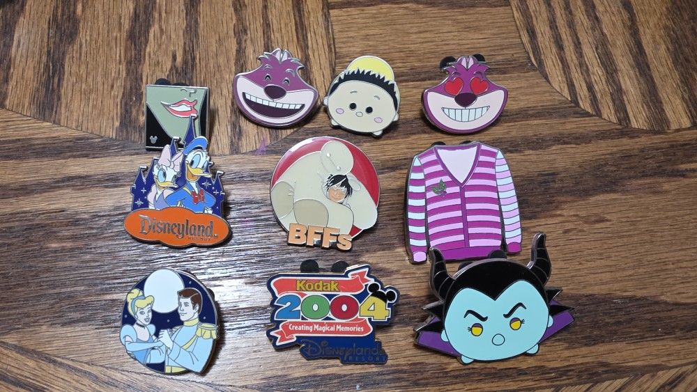 Set of 10 Disney pins. Including some mystery pins, tsumtsum, emoji, hidden Mickey and old pins. Pricing changes for individual pins.