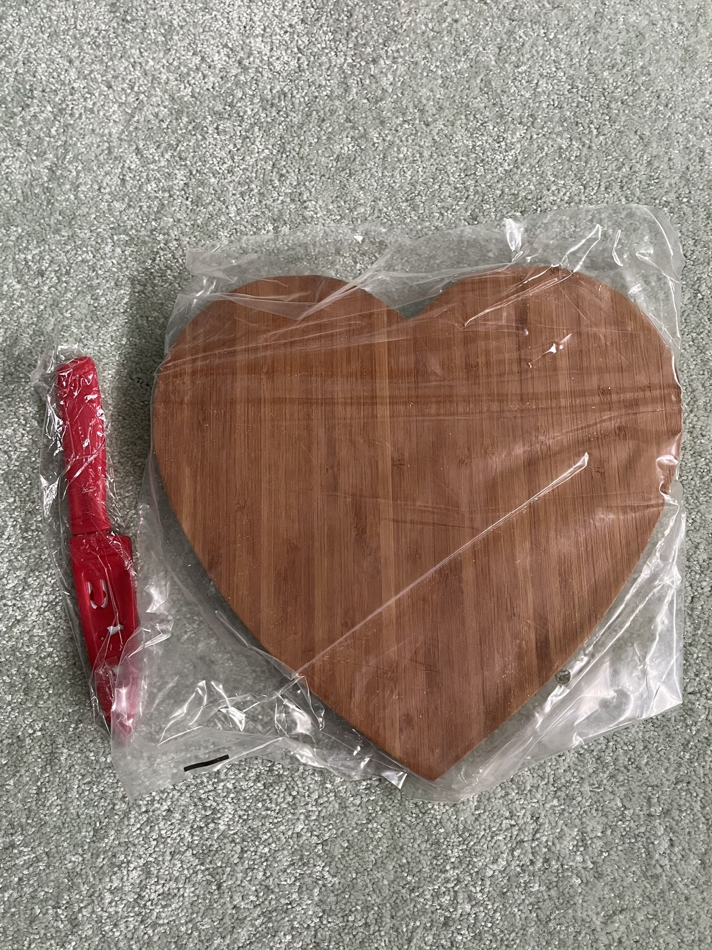 The 2013 Avon Bamboo Heart Shaped Cutting Board with Knife is a small, modern-style cutting board made of bamboo and wood. It features a heart shape with a medium brown wood tone and a reversible design. The cutting board is hand wash only and comes with a knife. It measures 10.5 inches in length, 10 inches in width, and 0.5 inches in depth, weighing 1 pound. The set includes two items, and the cutting board will fit your needs. The brand is Avon, and it is made in China.