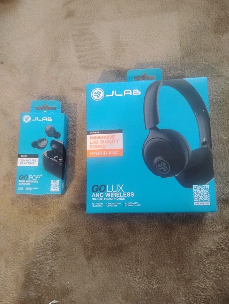 Brand new * Jlab go lux Jlab go pop+ Color :black Brand new in original package never been used Lab quality sounds Noise cancelling Clear sound and loud bass Connect to jlab app and customize the sound cloud cushion padding for extra comfort Splash proof &sweat proof Jlab go lux can be paired to two devices at the same.time Retail price for both starts at $60 -$70 asking for only $$20 would rather keep them but I have to sell them in order to pay bills since I'm currently in between jobs right now ....I'm in Avondale message me if serious about picking up thank you