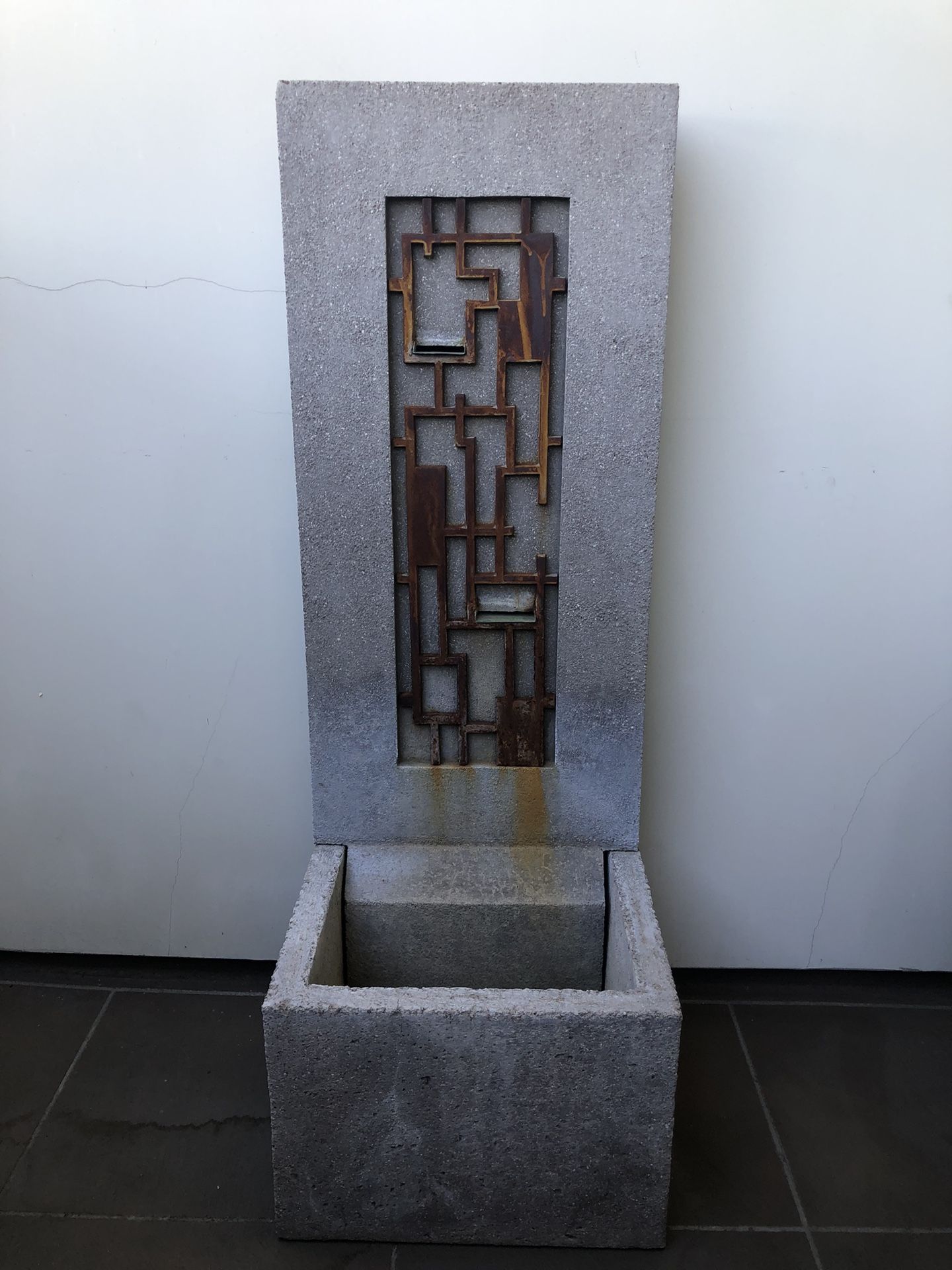 Concrete and metal small scale water feature. Has a Frank Lloyd Wright feel to it. Plugs in, pump not included. Water comes out at two spots delivering a nice sound. Note that most pumps are adjustable. See dimensions in photos. Perfect for a patio or yard.