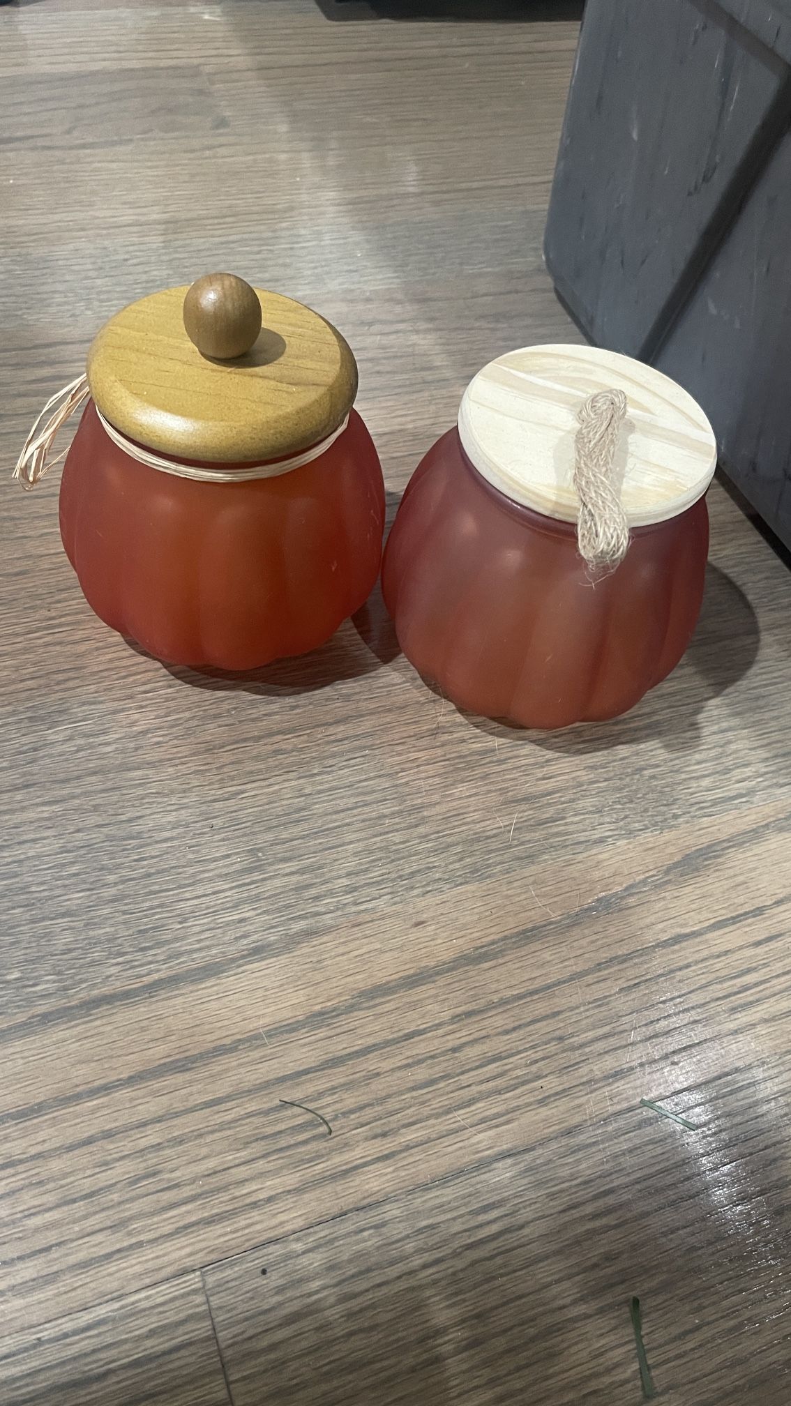 These are two frosted glass jars shaped like pumpkins. They come with wooden lids, one with a wooden ball knob and the other with twine. They're great for seasonal decor or storing small items!