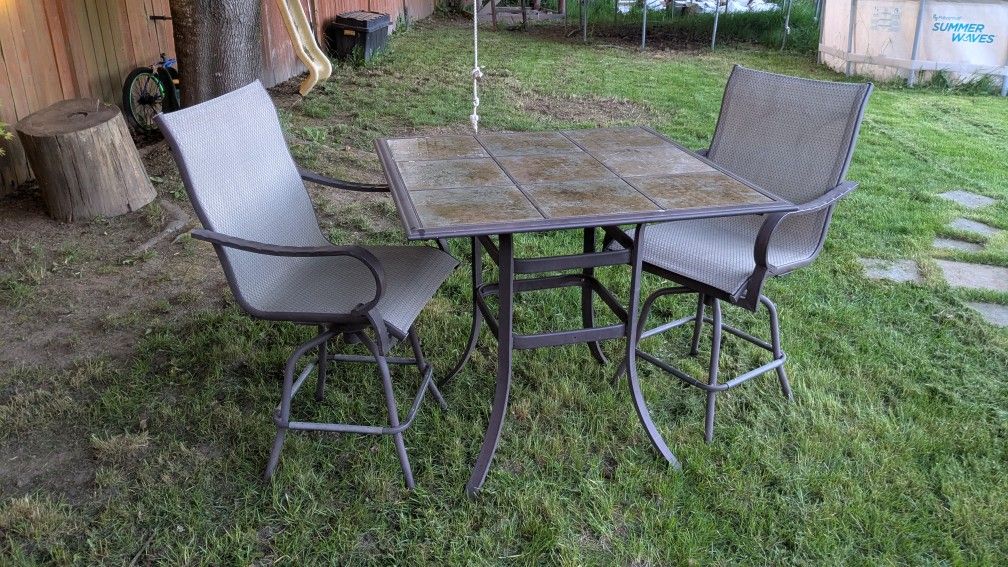 Nice Metal W/Tile Top Patio Pub Table With 2 Swivel Stools