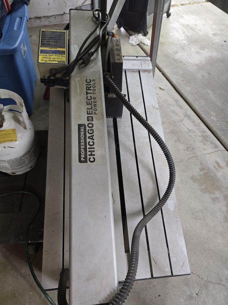 Runs well in good condition. Comes with blade. Stand not included. The 1.5 HP 7 in. bridge tile saw is designed for cutting ceramic tile, quarry tile, marble, terra-cotta and slate up to a maximum thickness of 1 in. @ 90°, 1 in. @ 45°. The design also accommodates cut-lengths up to 25 in. long. Cuts masonry up to 25 in. long Makes bevel cuts from 0 to 45° left Rip fence scale: 0 in. to 9-1/2 in. in 1/8 in. increments and 0 to 245mm in 2mm increments Waterproof on/off switch Handy storage drawer