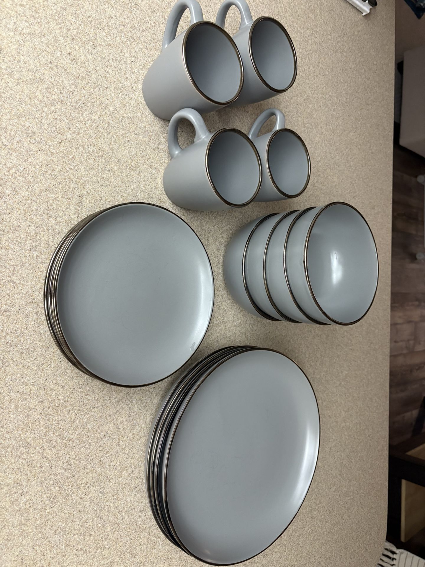 12 piece Grey Ceramic dish set with gold ring. One big plate has a small chip. $50 OBO