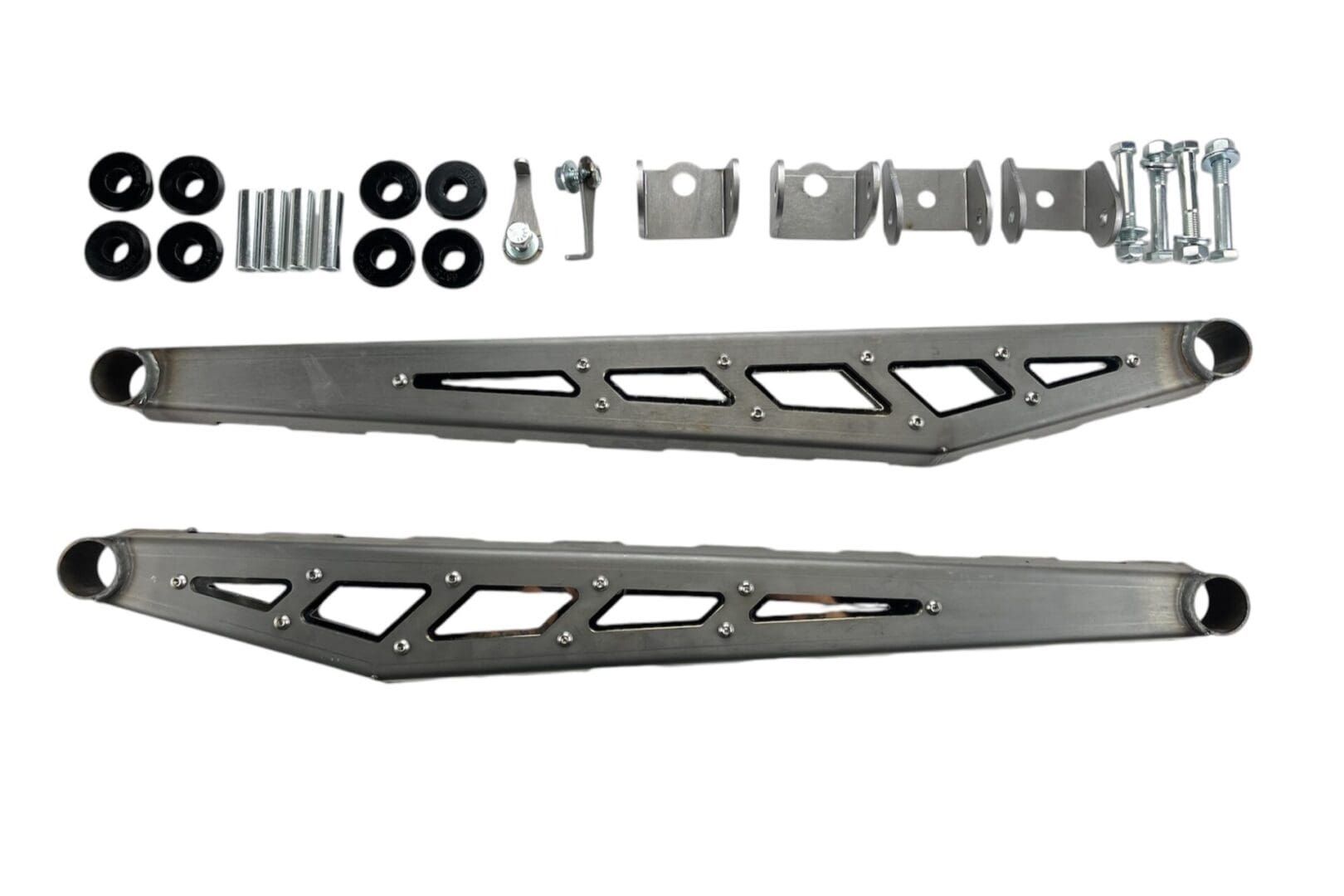 Kit Includes: (2) Boxed Style Compression Struts w/ Stainless Steel Inserts, (2) Brackets for Crossmember, (2) Brackets for Frame, (8) Bushings, (4) Insert Sleeves, & All Hardware Upgrade / Add-On kit for McGaughys 4″ lift kits Set of McGaughy’s boxed compression struts & brackets Includes S/S inserts, w/ Bushings and insert sleeves Compression struts & brackets come RAW, NO powder-coat