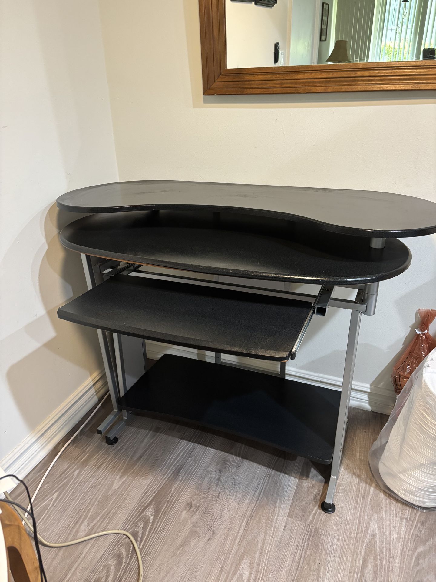 Black Computer Desk – Good Condition (Used) Selling a black computer desk in good condition. It has a modern design with multiple levels, including a pull-out keyboard tray and a lower shelf for storage. The desk is sturdy and fully functional, with only minor signs of normal use. Perfect for home office, studying, or small spaces. • Color: Black with silver frame • Features: Pull-out keyboard tray, extra shelves • Condition: Used, but in good shape • Clean and ready for use Pickup only.