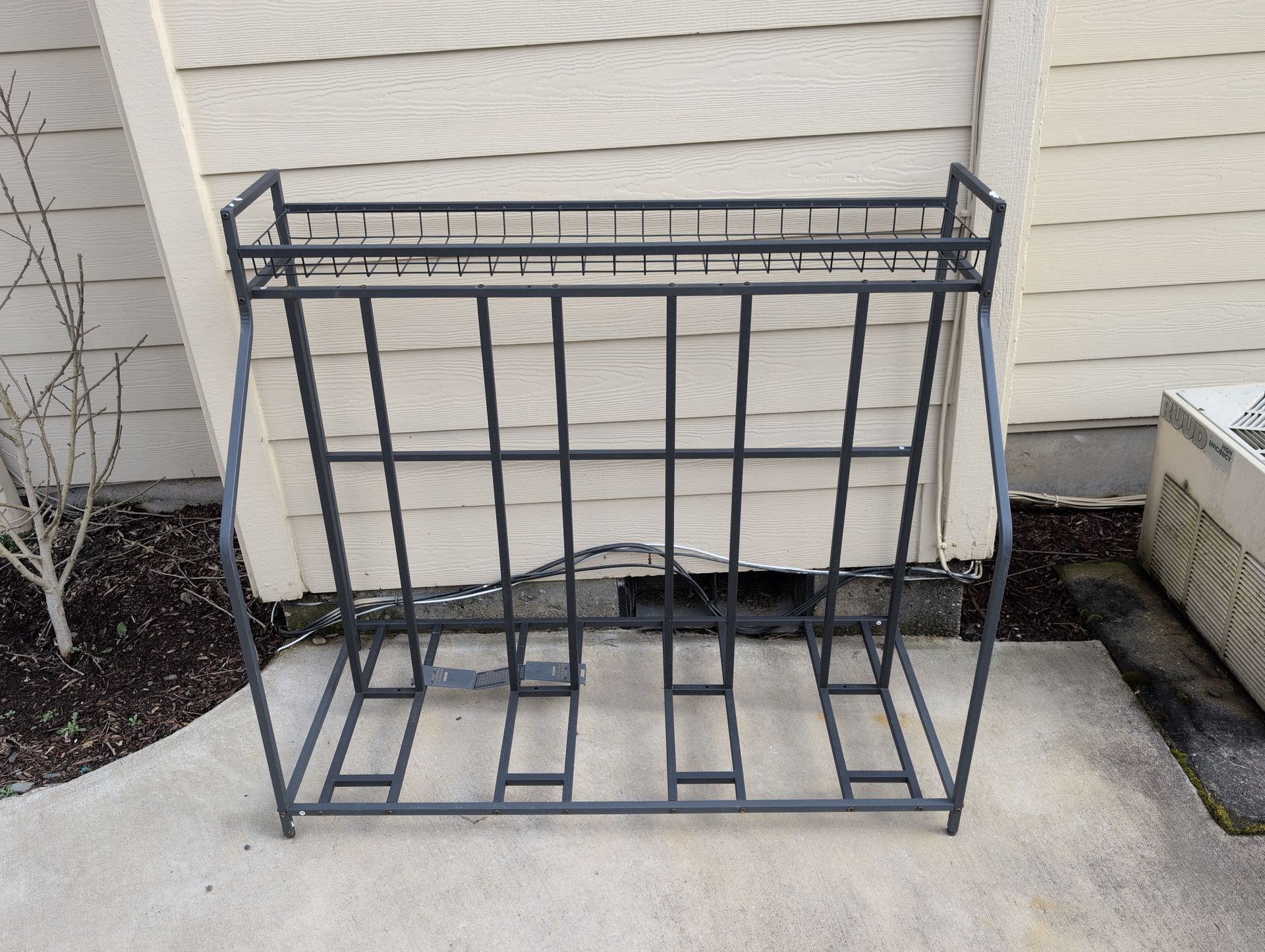 Good for 4 bikes, top rack holding helmet. No space in my garage.