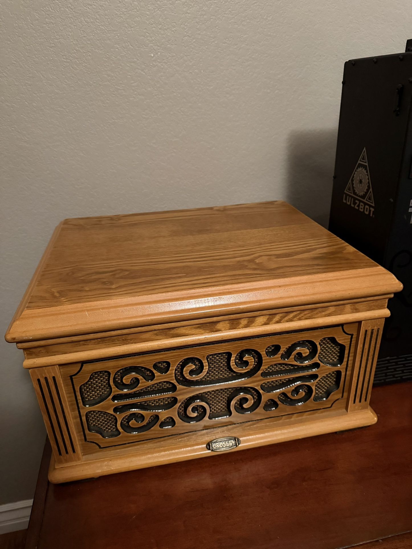 Crosley CR48 1940s Retro Style 3-Speed Turntable Key Features: • 1940s Aesthetic: Features a classic arched "cathedral" silhouette with a real wood veneer cabinet and a vintage-style analog tuning dial. • 3-Speed Versatility: Belt-driven motor plays records at 33-1/3, 45, and 78 RPM. • Plug-and-Play Setup: Built-in monaural amplifier and full-range speaker—no external speakers or complicated setup required. • Hinged Lid: Protects your vinyl while playing and maintains a clean look when not in use. • Simple Controls: Features a manual tone arm with a pre-fitted cartridge and stylus.