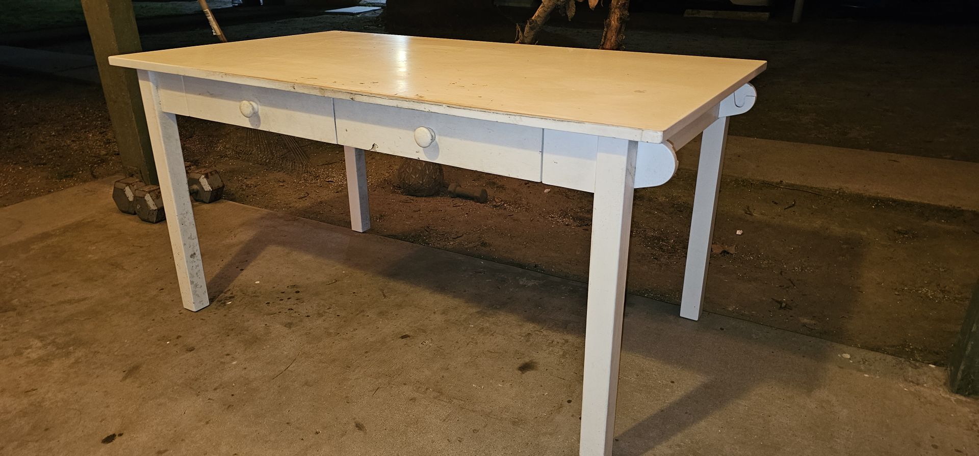 Craft Table kindergarten to 5th grade used minor paint and scratches. DIMENSIONS Overall: 27" wide x 48" long x 24" high Clearance under apron: 18.5" high Drawer Interior (2): 14" long x 13" deep x 3" high Legs: 2" square Weight: 57 pounds CARE Dust often using a soft, dry cloth. Protect from direct sunlight and extreme temperatures. Blot spills immediately with a clean, damp cloth. We do not recommend the use of chemical cleansers, abrasives, furniture polish or wax.