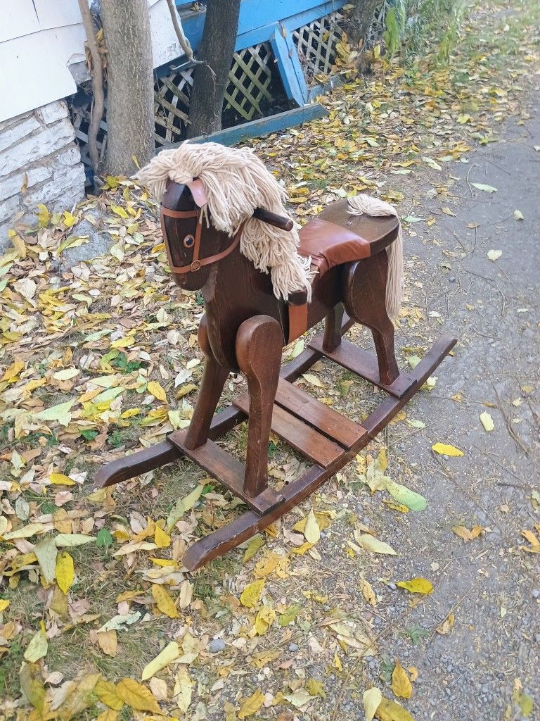 Large Solid Wood Rocking Horse, 24 Inches Seat Height, was in the back of the shed, the seat is 24 inches high, the length of the cradle is 44 inches and total height to top of horses mane is 37 inches, Any questions or concerns message me..