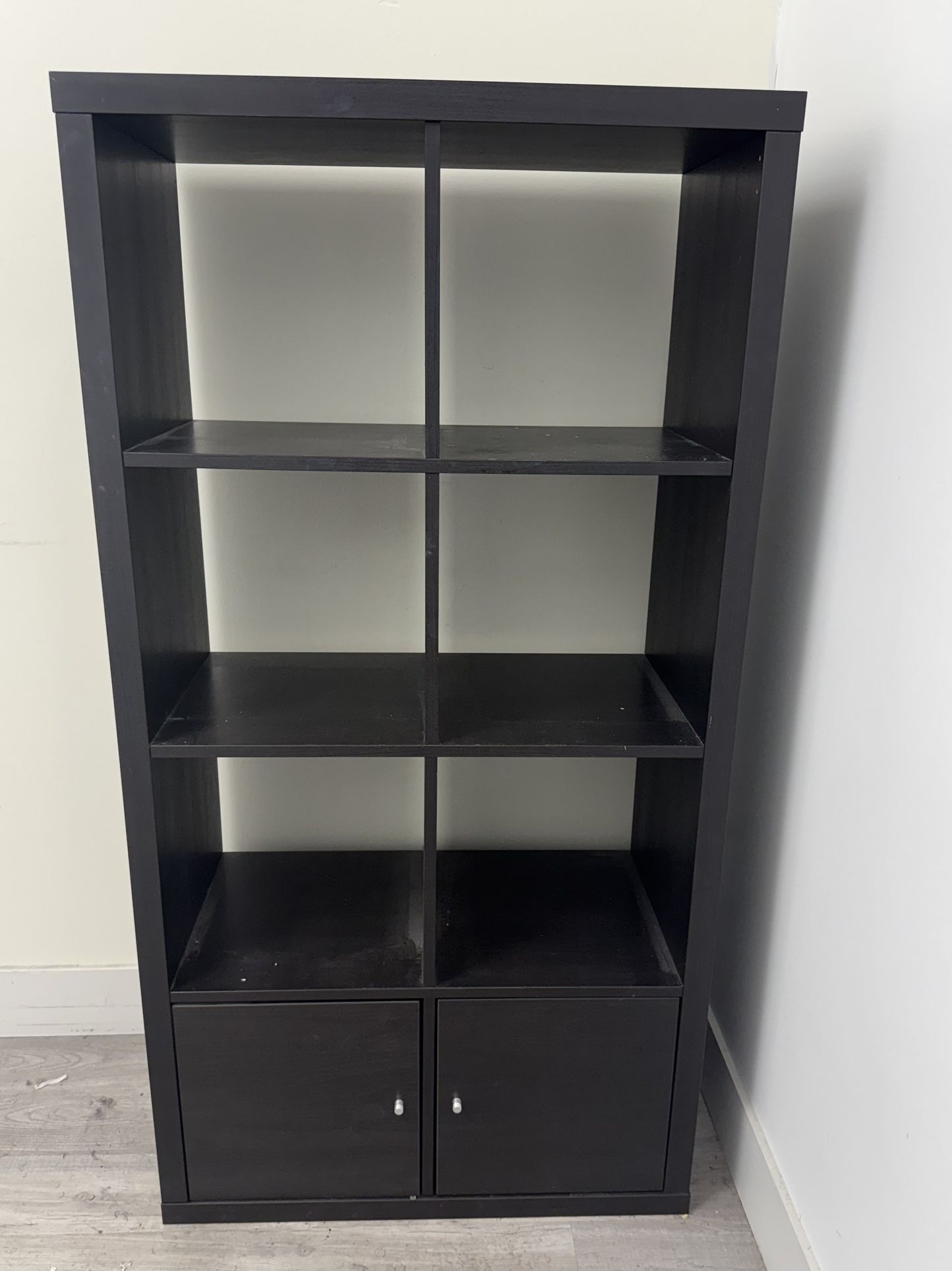 Sturdy black storage shelf with open cubbies and a bottom cabinet for hidden storage. Features multiple square shelves—perfect for books, décor, bins, or office supplies—plus two cabinet doors to keep items out of sight. Clean, modern look that fits well in a living room, bedroom, office, or entryway. Condition: Good used condition. Solid and stable with light cosmetic wear from normal use (see photos). Details: • Color: Black • Open cubby shelves + bottom cabinet • Modern, space-saving design • Great for home or office organization Pickup: Local pickup only. Message me if you’re interested or have questions!
