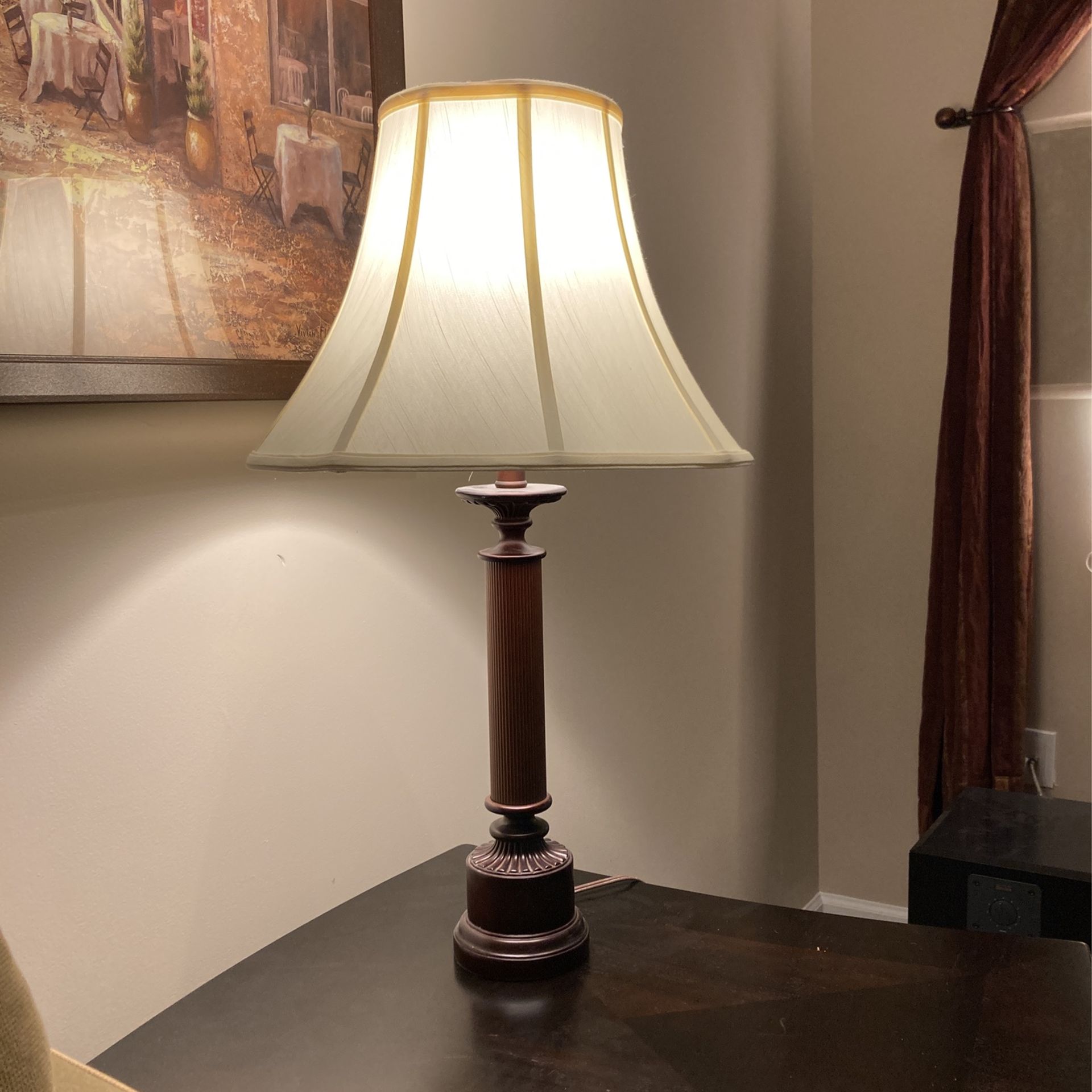 Bronze table lamp with shade. Utilizes one medium base (E26) bulb up to 150W.