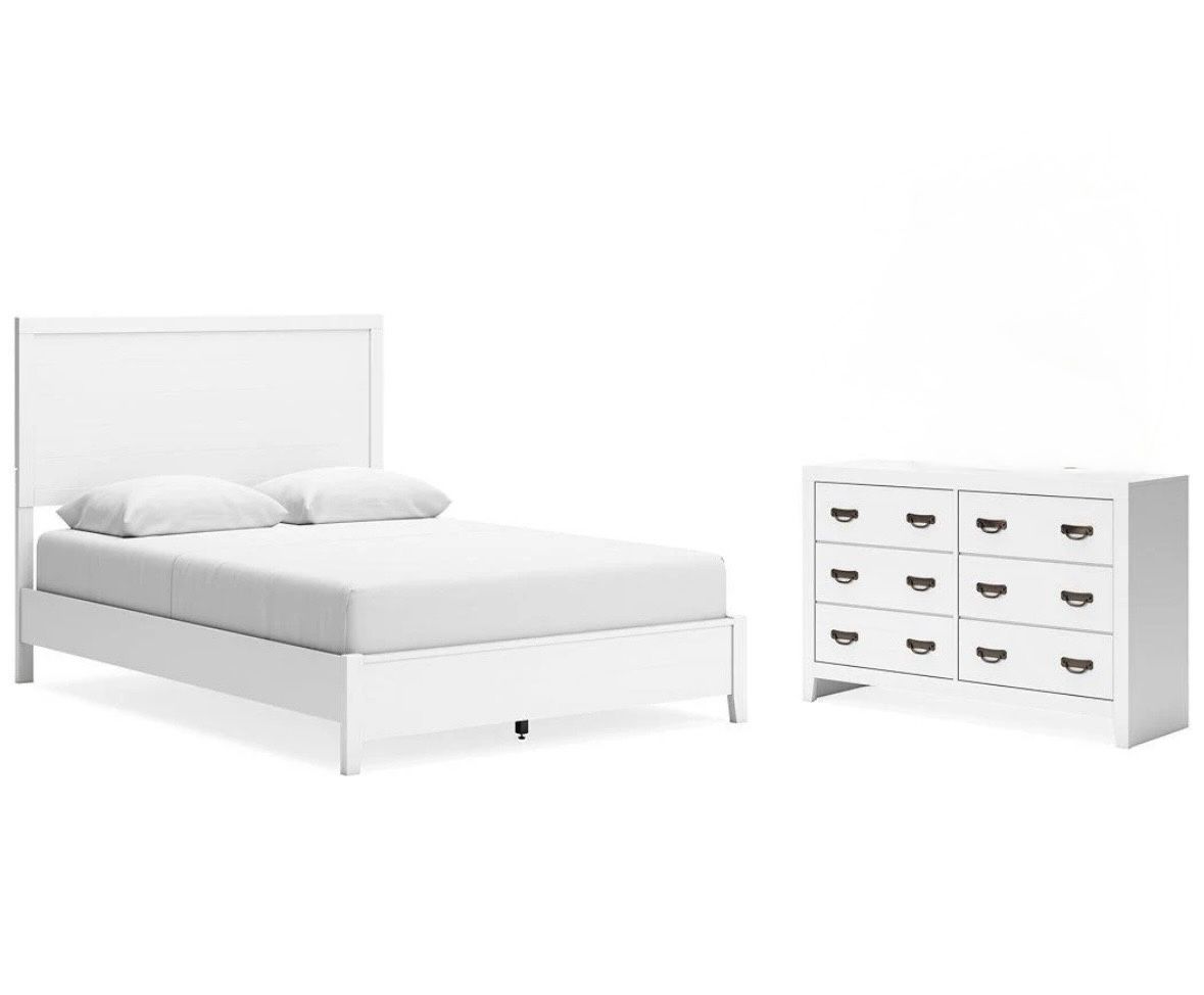 Elegant Signature Design by Ashley king bedroom set in excellent condition. Solid wood construction with a beautiful white finish. Clean, sturdy, and well cared for. Includes: • King bed frame • Dresser (no mirror) • Two nightstands • Mattress included High-quality furniture with a timeless look that fits modern or classic homes. Price: $1,500 Pickup only. Serious buyers only.