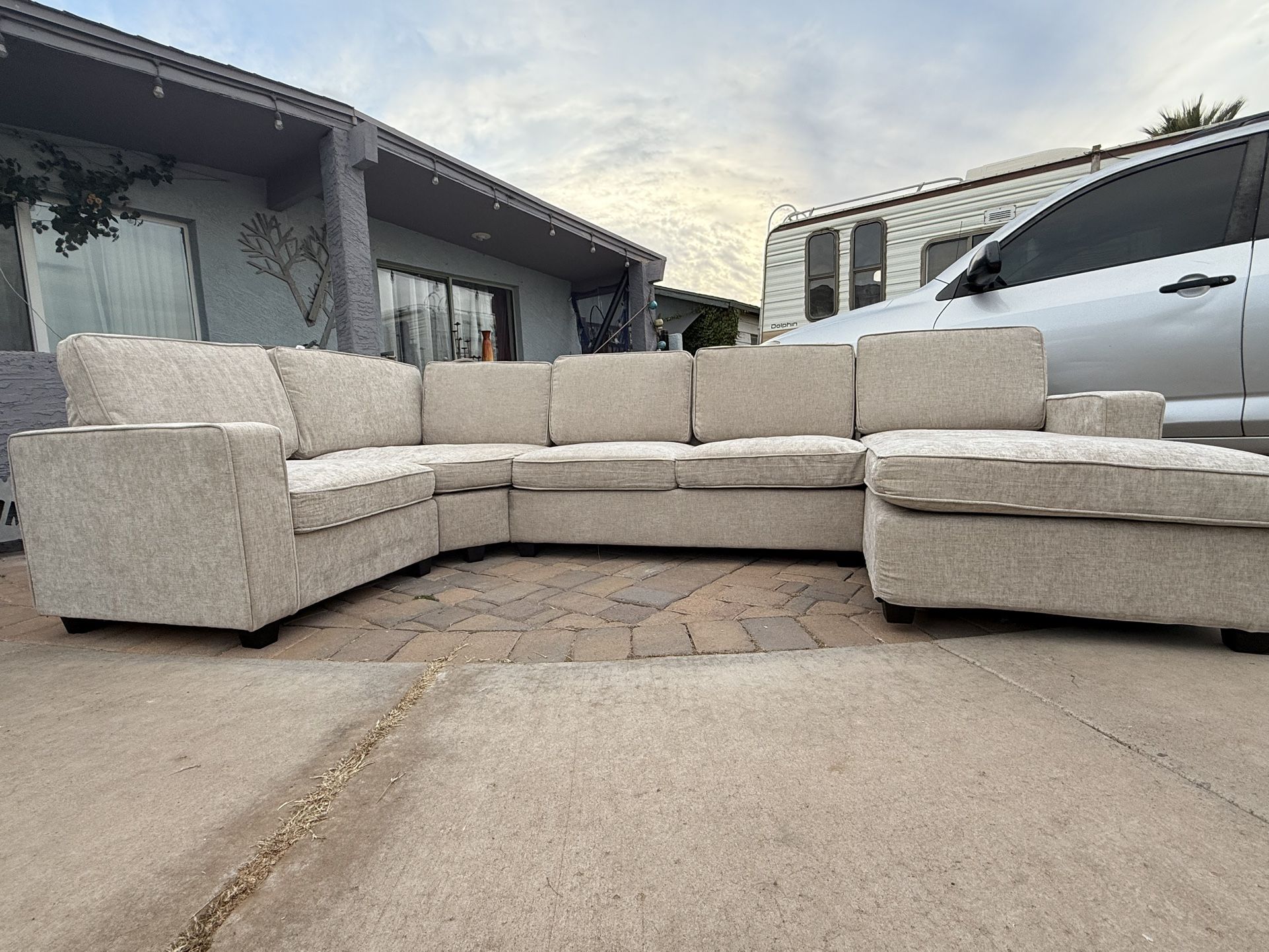 Large and comfortable sectional sofa in great condition. Includes 4 modular pieces, can be arranged in different layouts. Light color fabric, clean, no rips or stains. Includes chaise and built-in cup holder. ā Very spacious ā Comfortable cushions š Pickup only š² $500OBO