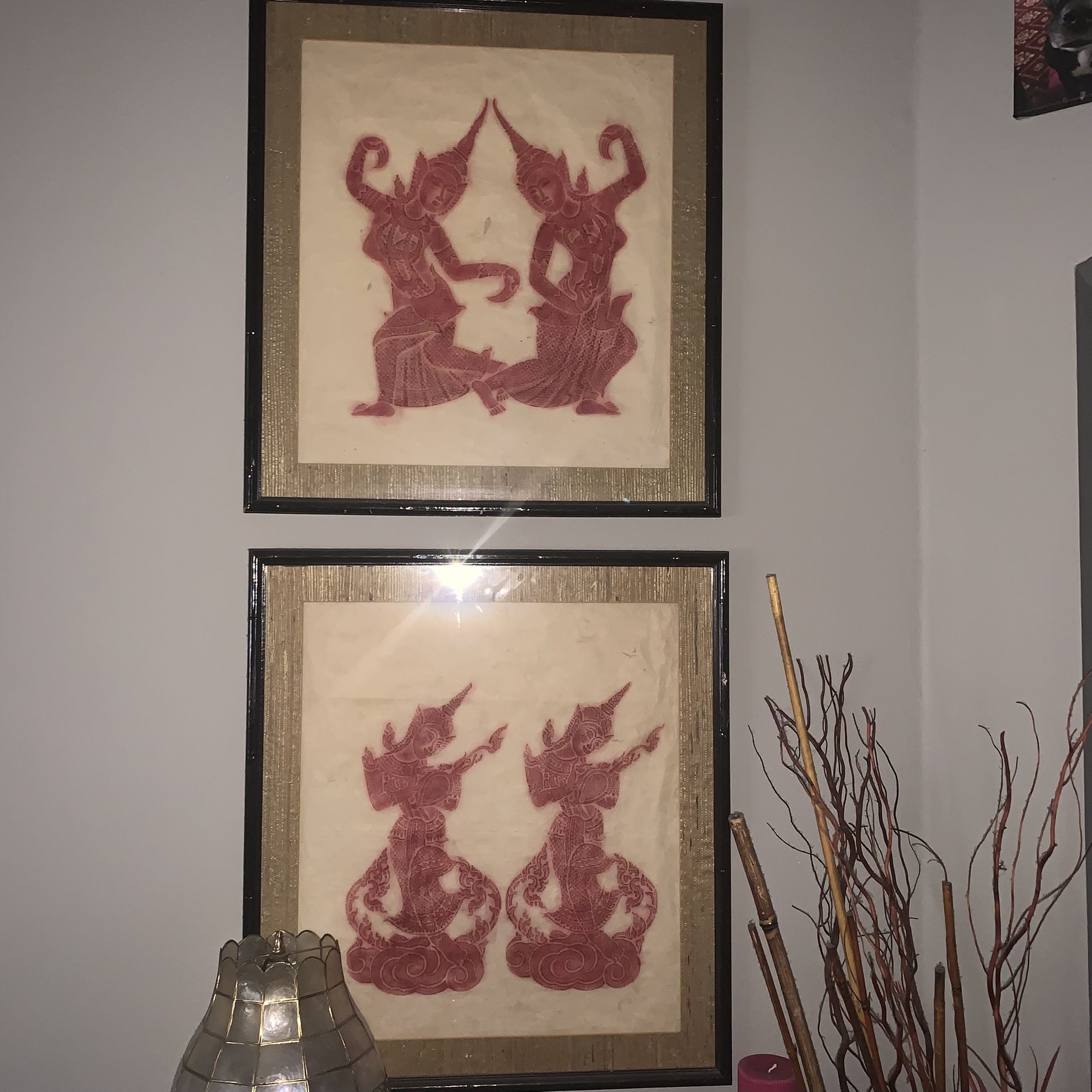 (2) Vintage Framed Temple Running (red) Asian Wall Art Pair