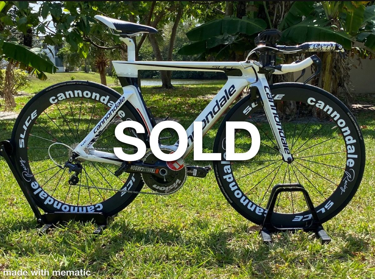 The ultimate in aerodynamic thinking, the Cannondale Slice RS Hi Mod is very very FAST. Used by the Cannondale Pro Race Team it is as unique in it's design approach as it is in appearance. Model Slice RS Hi-Mod Ultegra Size 50 Color White/Black Specifics: Bottom bracket Cannondale Aluminum PF30 BB Cup, FSA BB30 Bearing Brakes Cannondale Naero-Tec Integrated Mini-V Cassette Shimano 105 5700, 12-25, 10 speed Chain Shimano Ultegra 6700 Crankset FSA Trimax alloy rings, BB30 Features Naero-Tec External Steerer Fork: By moving the fork steerer outside the headtube we could use the smallest headset bearings possible, allowing for an unbelievably narrow headtube and reduced frontal area. The design is also extremely stiff for unmatchably precise handling. Thru-Headtube Internal Cables: The steerless fork design allows the shift and brake cables to be routed through the top of the stem and into the downtube via an innovative cable stop and guide. This is not only super aero, but also allows the bars to turn freely, eliminating any effect of cable housing on steering. CFit modular fit system: The modular bar/armrest adjustment system allows for a greater range of armrest stack and reach adjustment than even a standard bar/stem combo. The integrated 31.8 stem is adjustable in 5mm increments from 80 to 120mm, while the armrest height is adjustable in 2.5mm. Fork type Slice RS Aero, Carbon w/ integrated external steerer, Naero-Tec Frame type Slice RS, full carbon, AERO SAVE, PF30, Naero-Tec Front derailleur Shimano Ultegra 6700 Headset Tange Seiki Integrated Rear derailleur Shimano Ultegra 6700 Rims type Mavic Carbon Fiber Saddle Fizik Airone Tri2, manganese rails Shifters Shimano Dura Ace Stem Integrated, adjustable 31.8mm Handlebars - Vision carbon Brand new Custom Bar Tape Standard pedals included Tires Continental Grand Prix 4000 700X23c